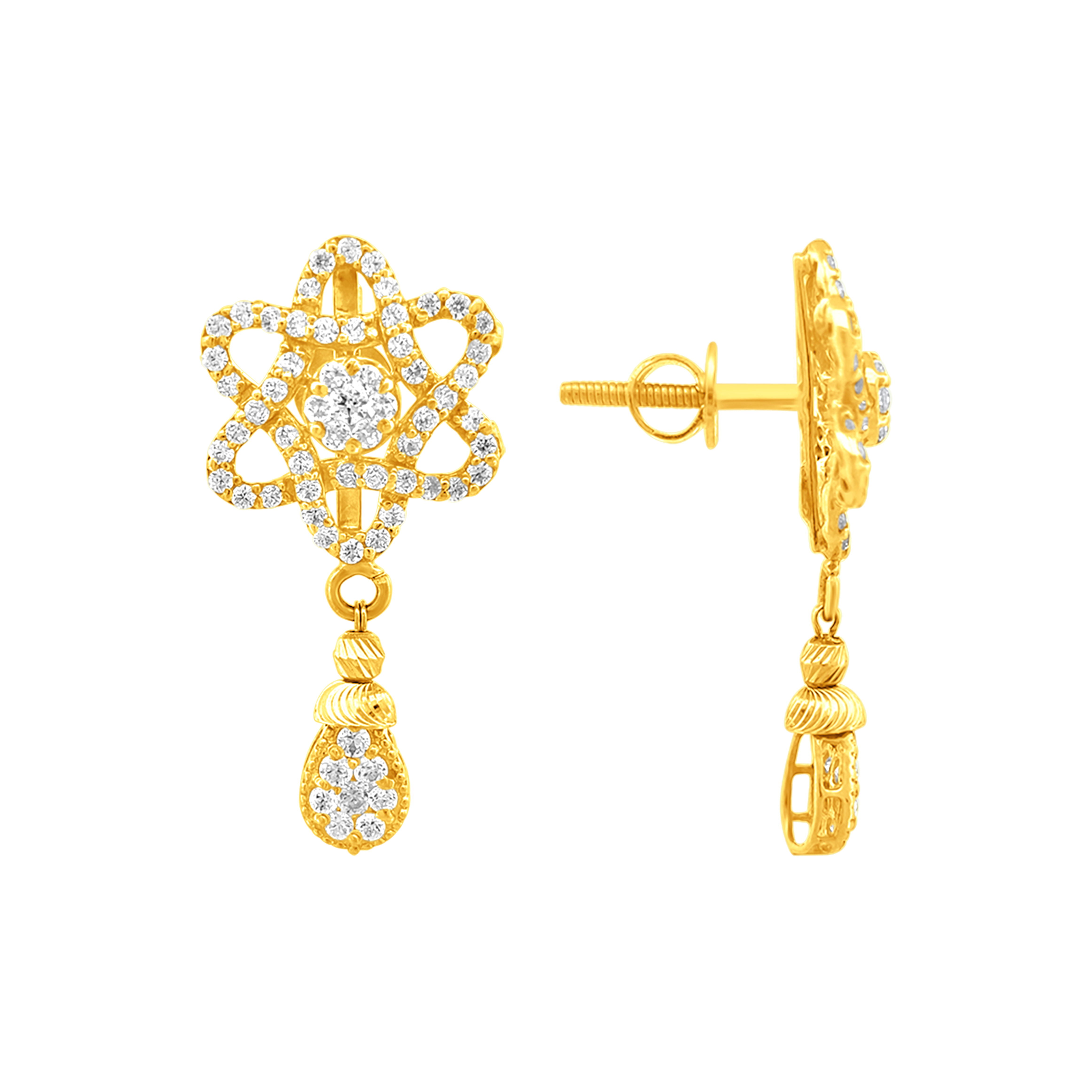 These stunning gold earrings feature an intricate floral design encrusted with dazzling white stones.
