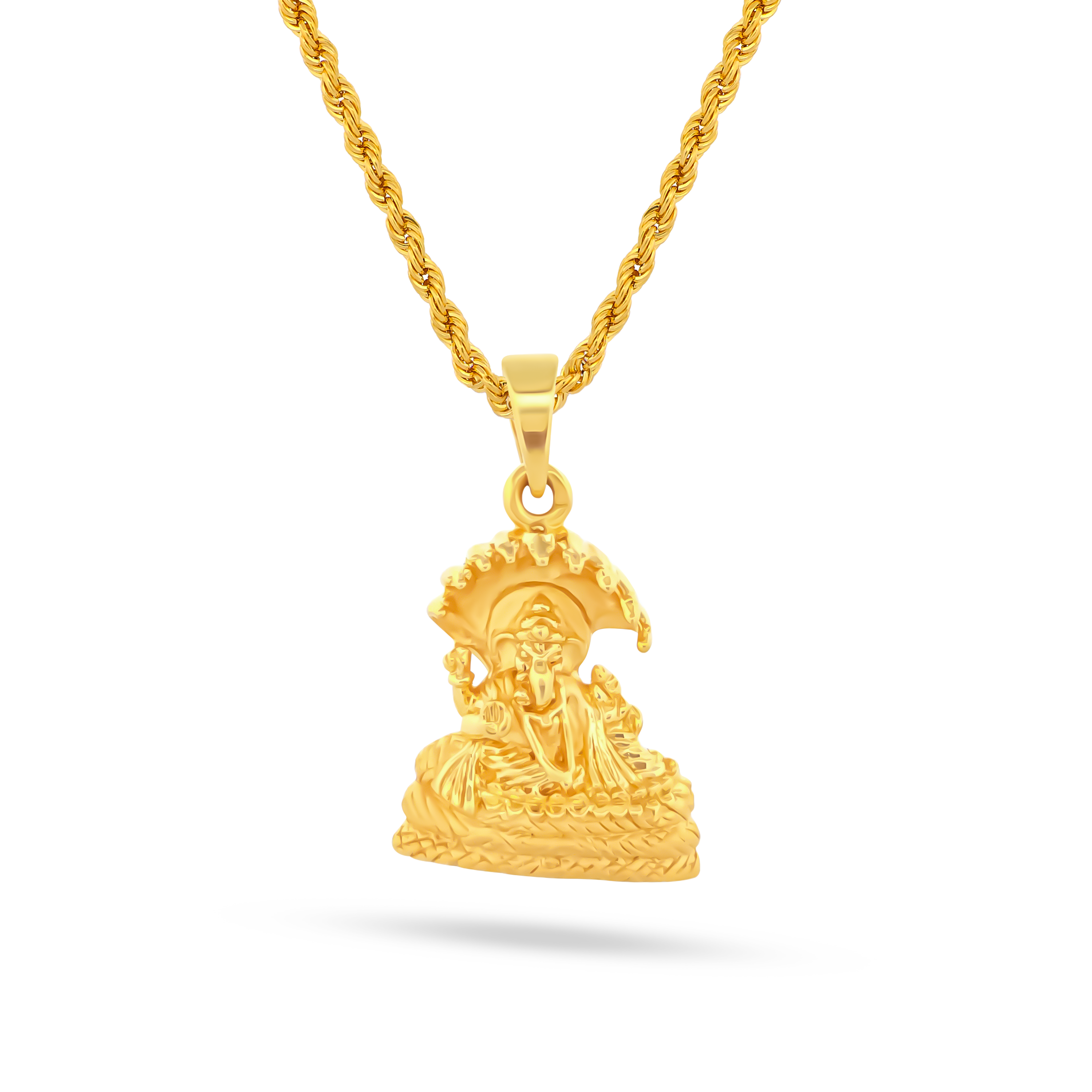 Crafted in pure gold, this intricately designed pendant features Lord Vishnu seated gracefully on the sacred Sheshnag, symbolizing divine protection and wisdom.
