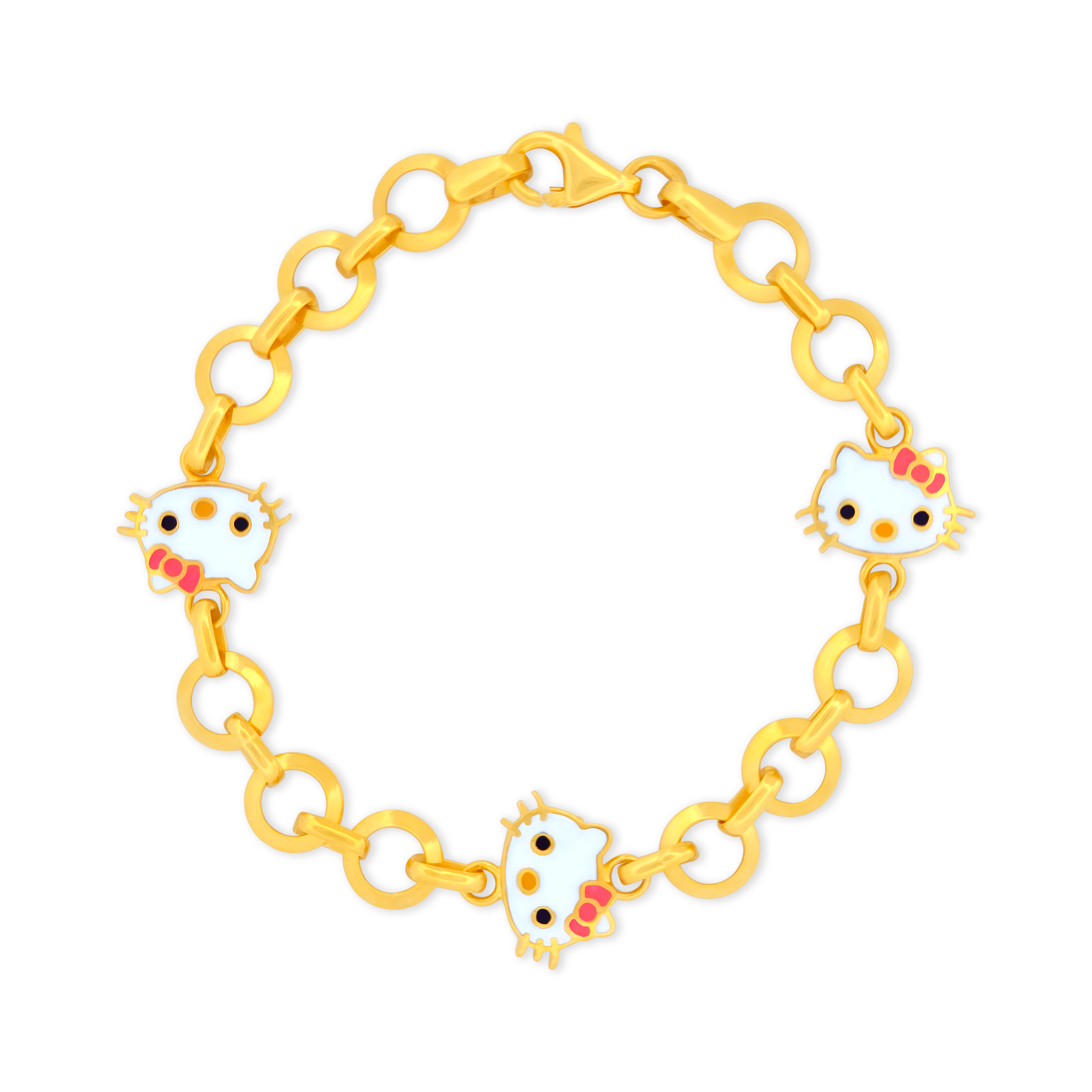 A delightful gold bracelet adorned with adorable white enamel kitty charms and pink bows, adding a touch of charm to any outfit.