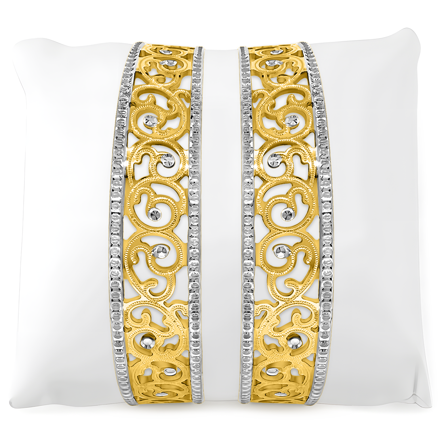 22K (916) gold bangles, set of two, available in classic all-gold or a refined two-tone rhodium hue on a gold base, catering to diverse tastes. The design features a stunning laser-cut floral pattern on a satin finish, blending intricate detailing with understated elegance. Available in various sizes, these bangles offer a perfect balance of modern design and timeless sophistication, making them a versatile addition to any jewelry collection.