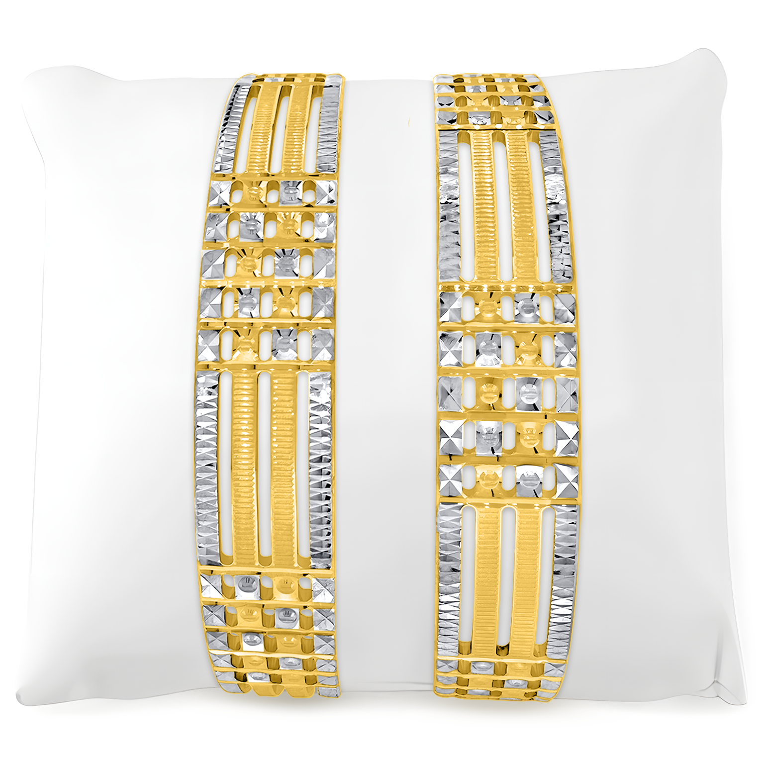 22K (916) gold bangles, set of two, available in classic all-gold or a refined two-tone rhodium hue on a gold base, catering to diverse tastes. The design features intricate laser-cut detailing, enhanced by a brush-like texture and a knitted pattern on a satin finish. Wide in width and available in various sizes, these bangles are a perfect blend of modern artistry and timeless sophistication.