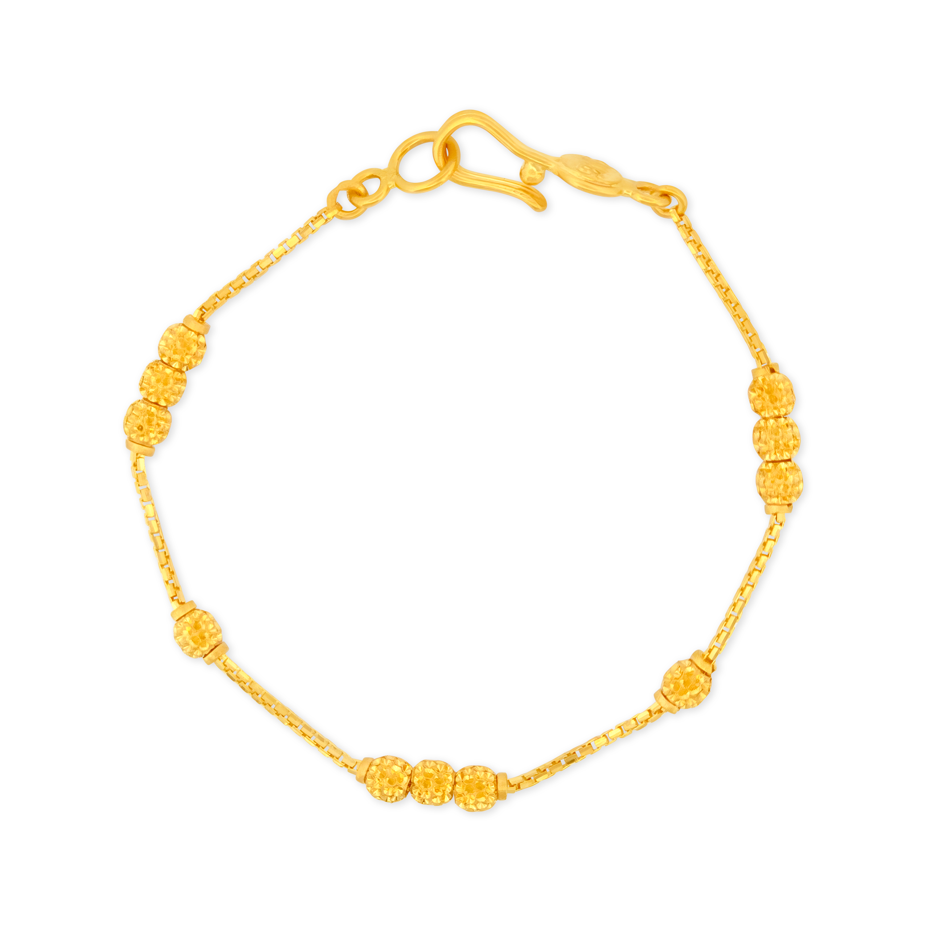 This exquisite gold bracelet showcases a delicate chain design adorned with intricately detailed beads.