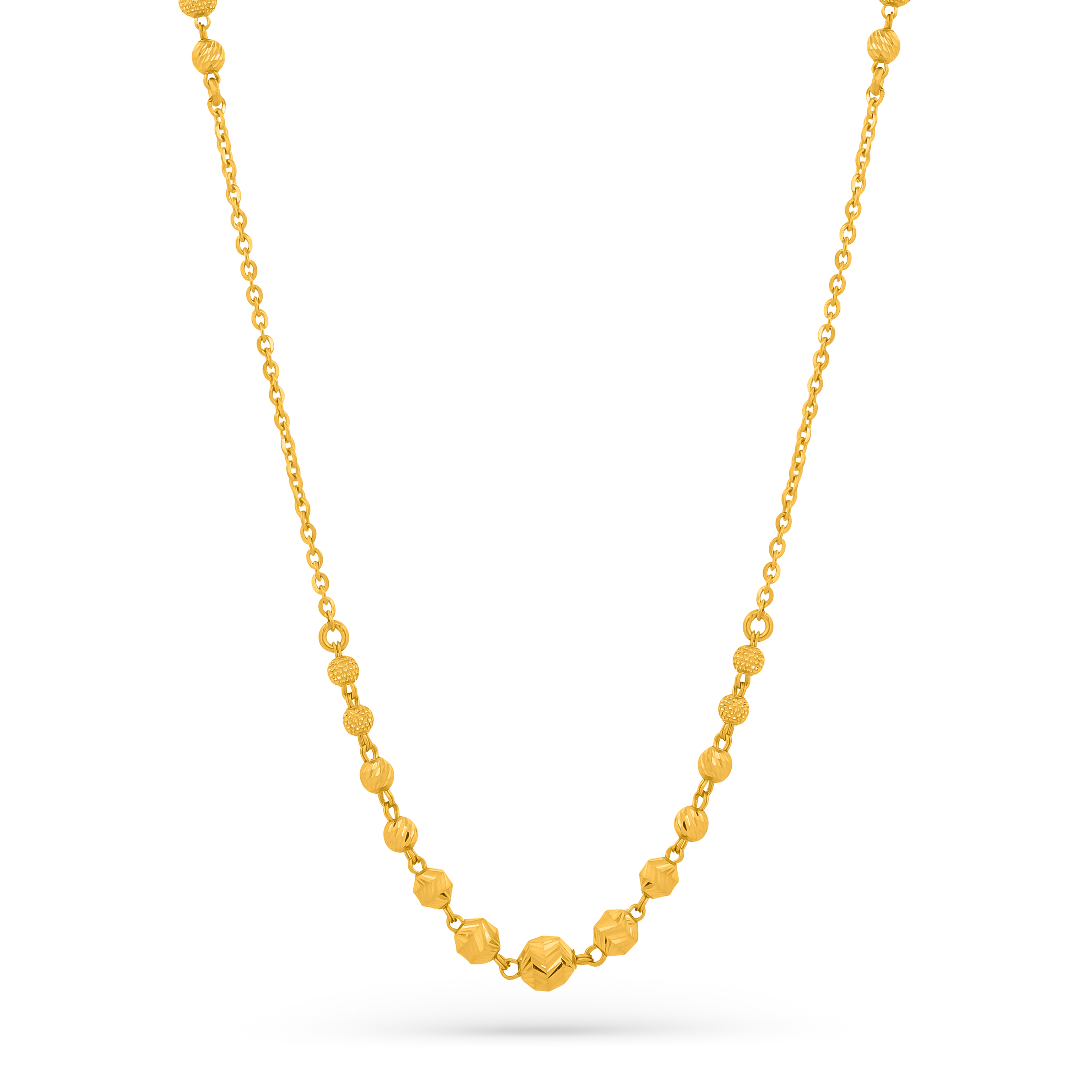 A timeless masterpiece, this gold necklace features intricately designed beads with a polished and textured finish.