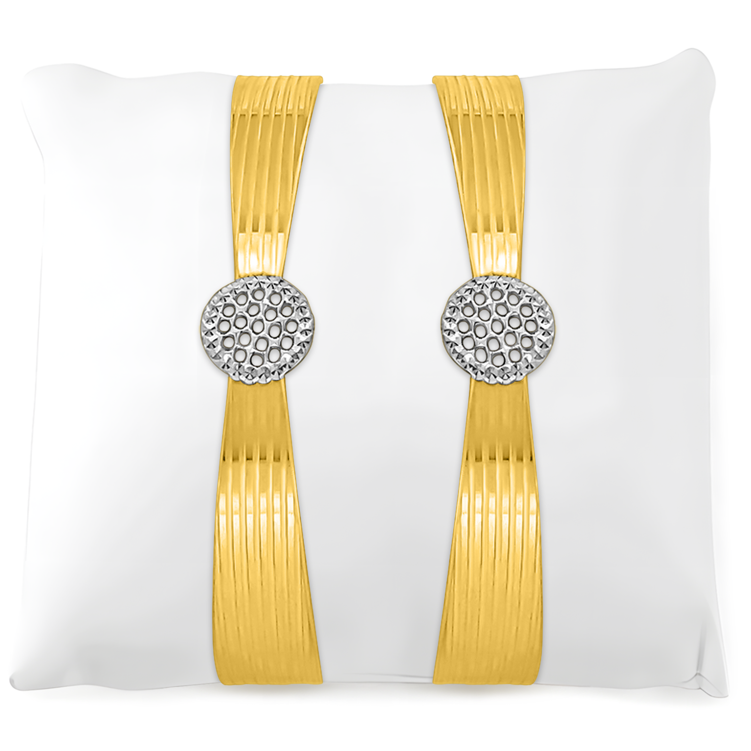 22K (916) gold bangles, set of two, available in classic all-gold or a refined two-tone rhodium hue on a gold base. The design showcases a satin base with intricate laser-cut flower patterns adorning both ends, offering a harmonious blend of charm and elegance. Available in various sizes, these bangles are perfect for complementing any style, from everyday wear to special celebrations.