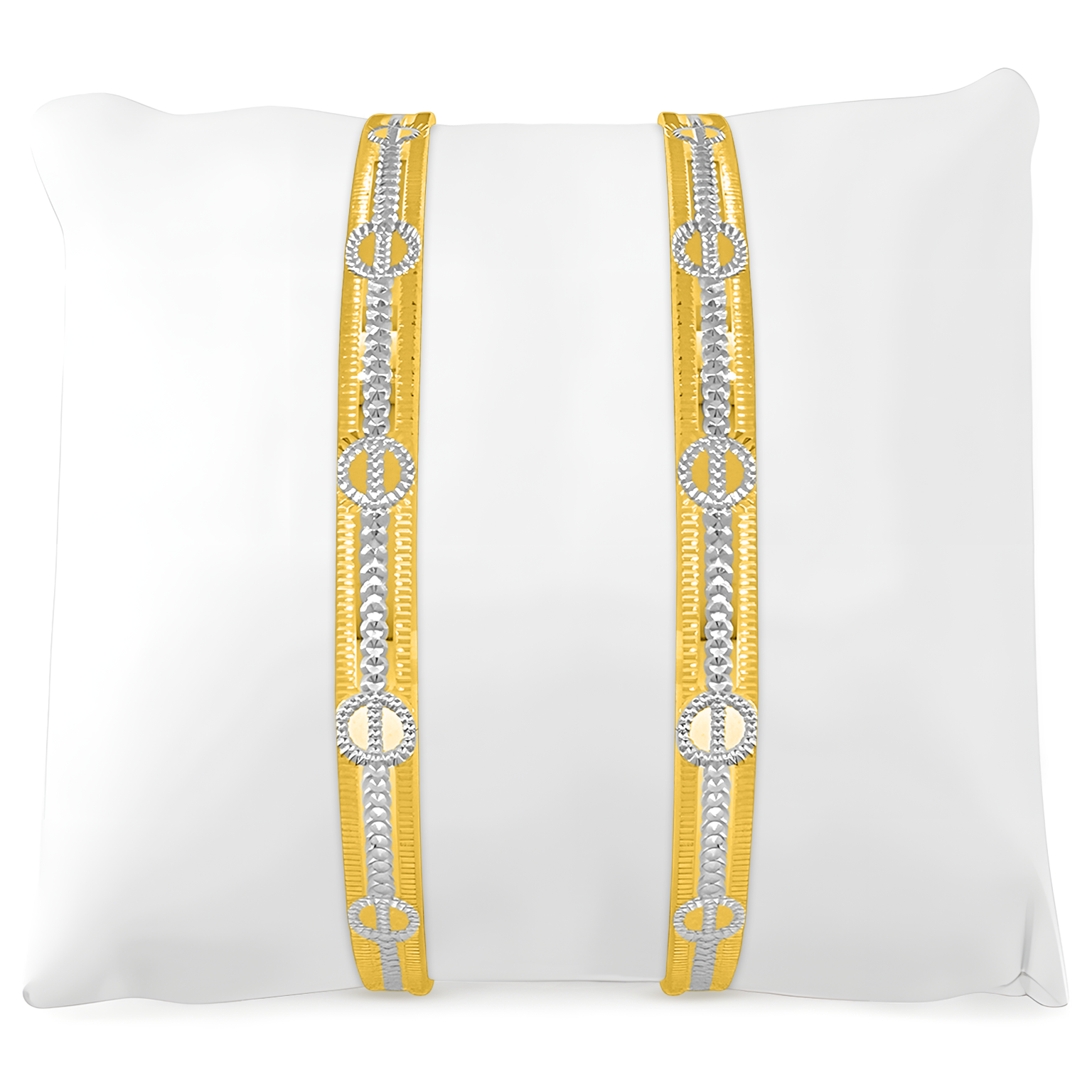 22K (916) gold bangles, set of two, available in classic all-gold or a refined two-tone rhodium hue on a gold base. The design features a sparkling dot pattern, meticulously aligned at the center of the bangle, set against a satin-finish. These bangles, available in various sizes, offer a contemporary and elegant touch to your jewelry collection, perfect for both daily wear and special occasions.