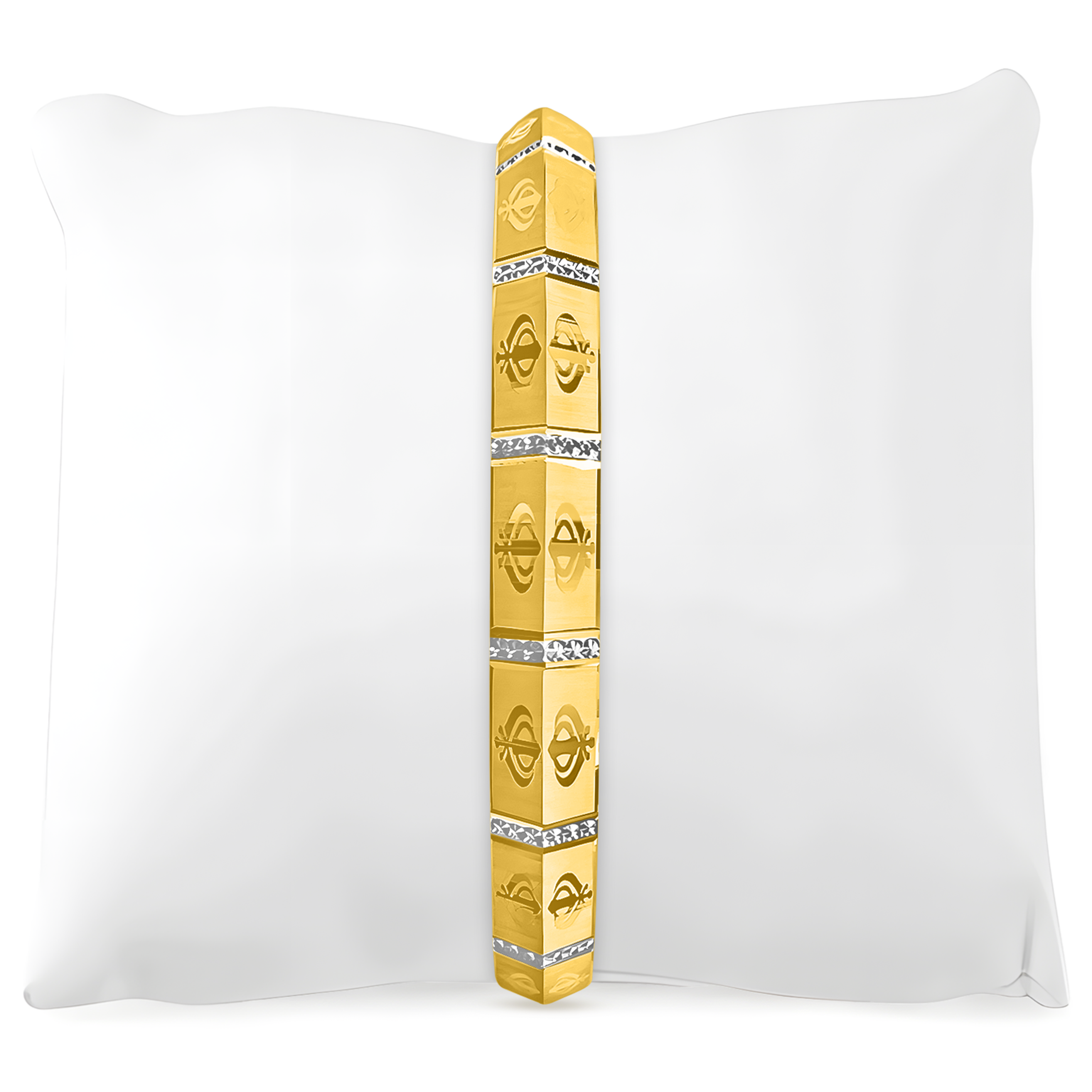 A majestic 22K gold kada featuring a Khanda pattern intricately designed in sections, symbolizing faith, strength, and warrior spirit with a timeless and elegant appeal.