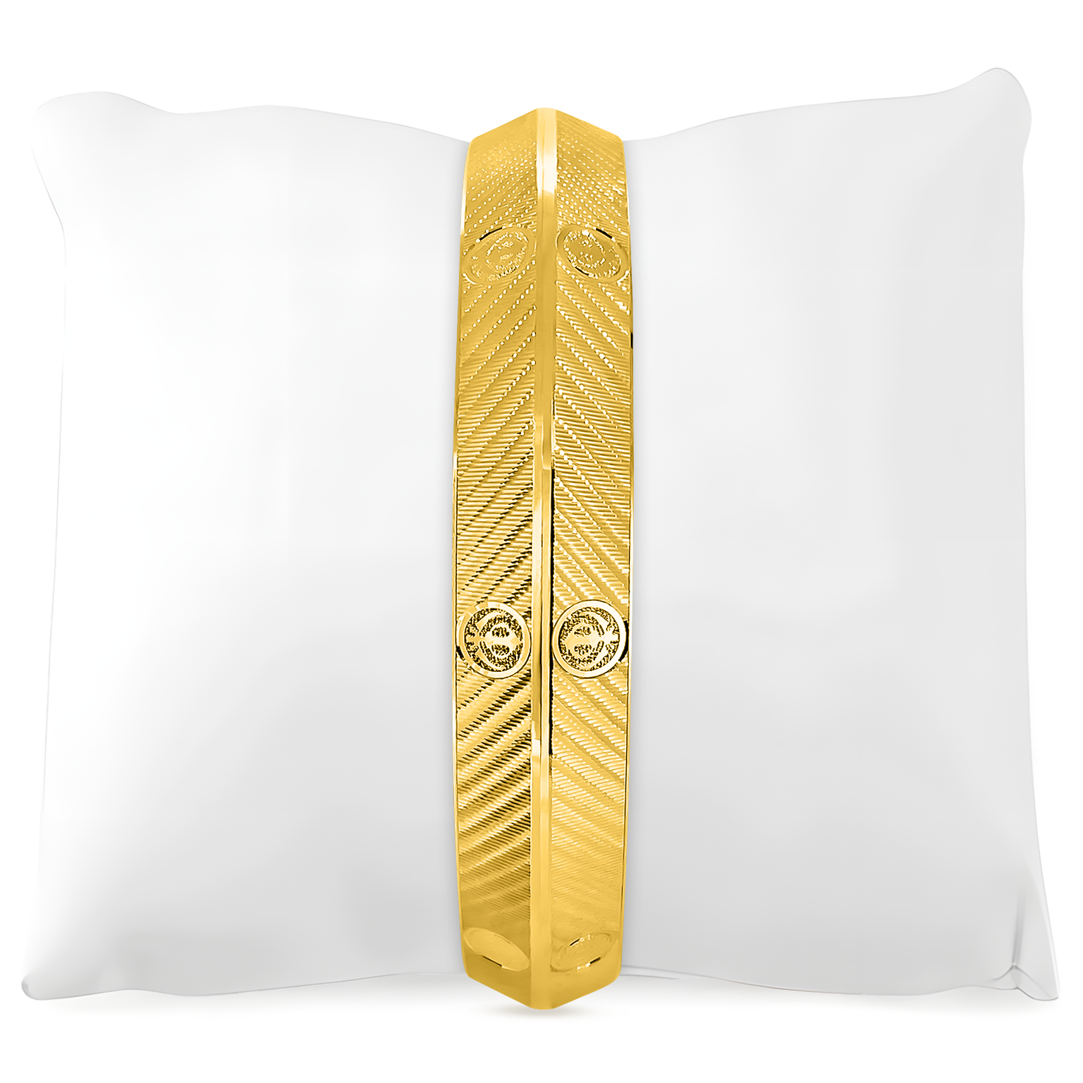 A stunning 22K gold kada featuring the Khanda symbol intricately engraved in a unique and artistic design, reflecting faith, strength, and timeless elegance.
