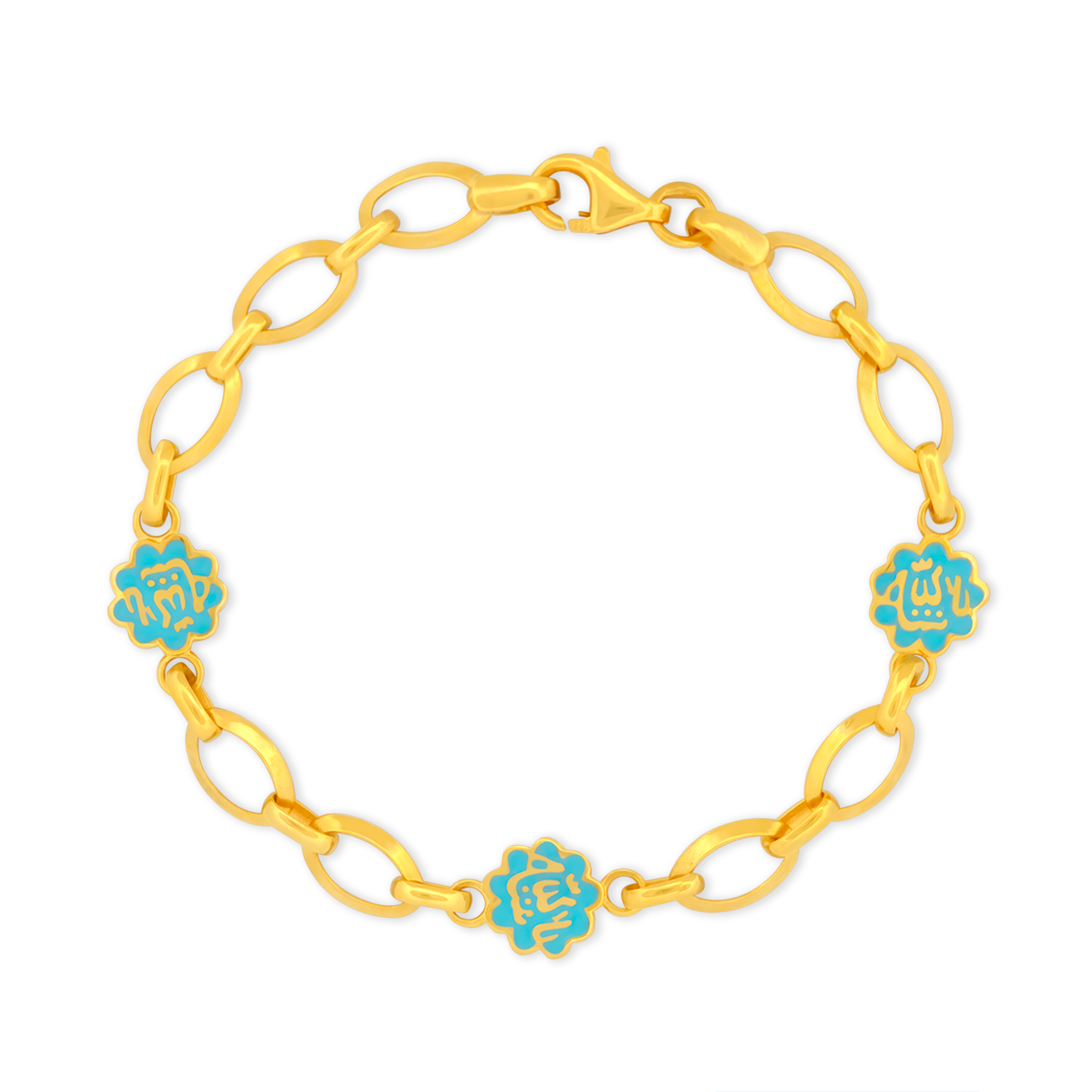 Elegant gold bracelet with turquoise Arabic calligraphy charms, symbolizing faith and sophistication.