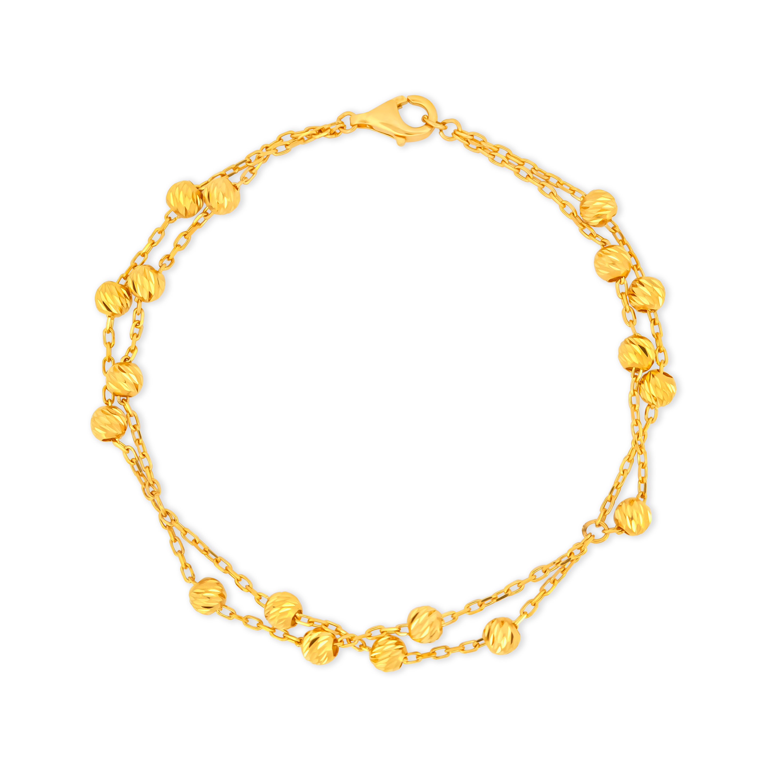 This beautifully designed dual-layered gold bracelet features a delicate chain adorned with finely textured gold beads, adding a touch of elegance and sophistication.