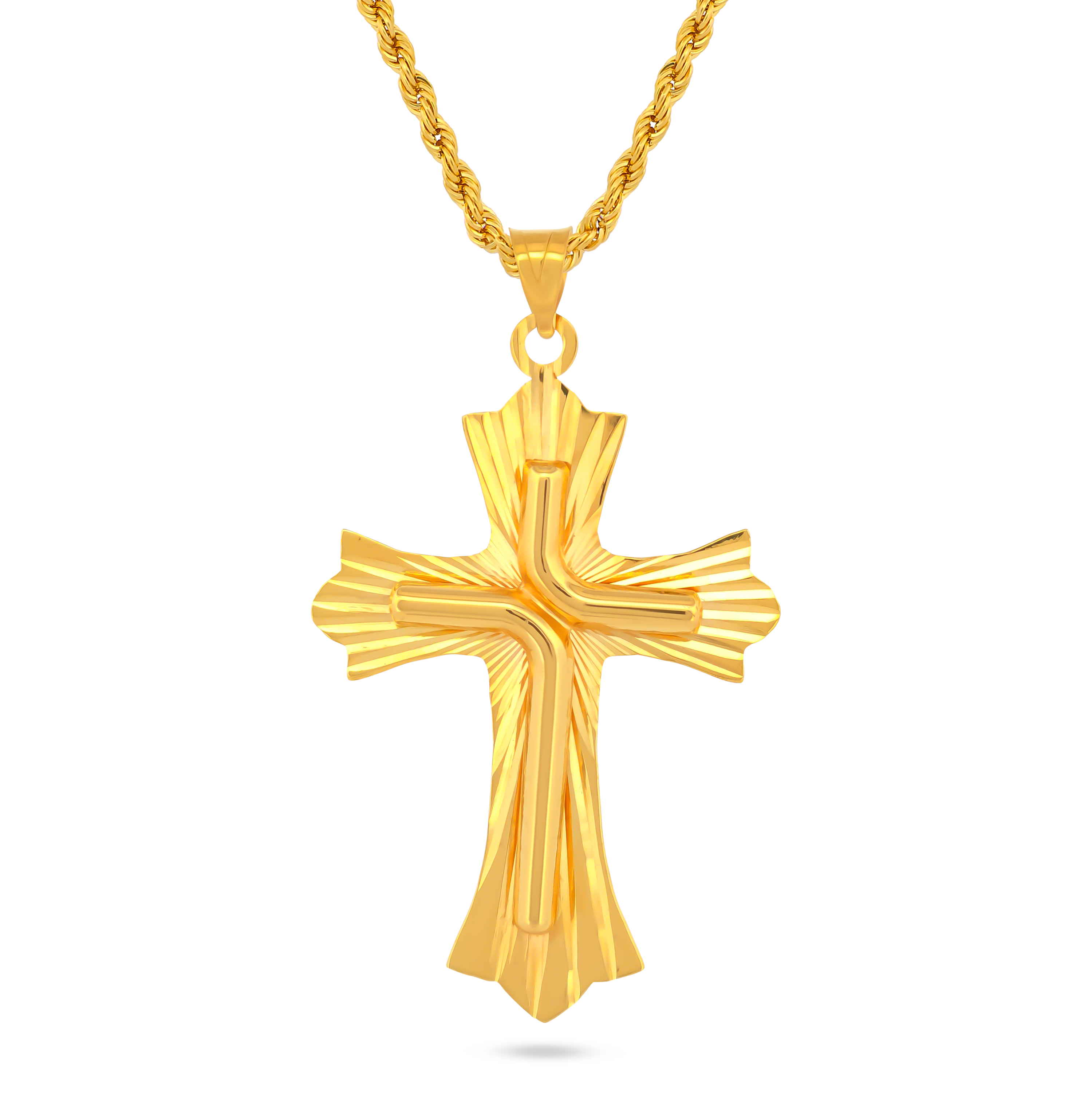 Astunning gold rope chain featuring an intricately designed cross pendant. The pendant boasts a textured, radiant finish with elegant detailing, symbolizing faith and strength.