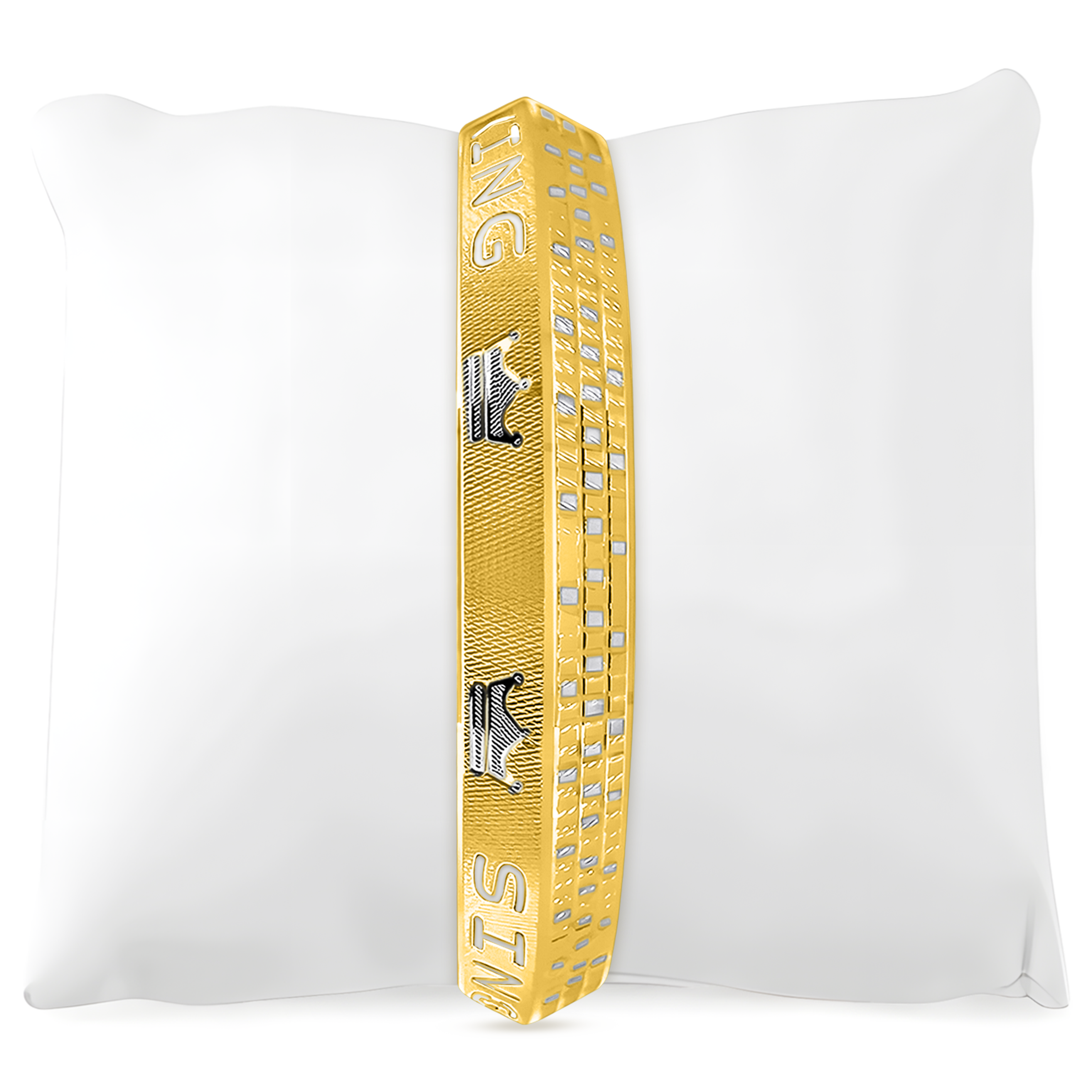 A magnificent 22K gold kada featuring a bold, see-through engraving of "SINGH IS KING," allowing for enhanced visibility while showcasing strength, pride, and regal elegance in its design.