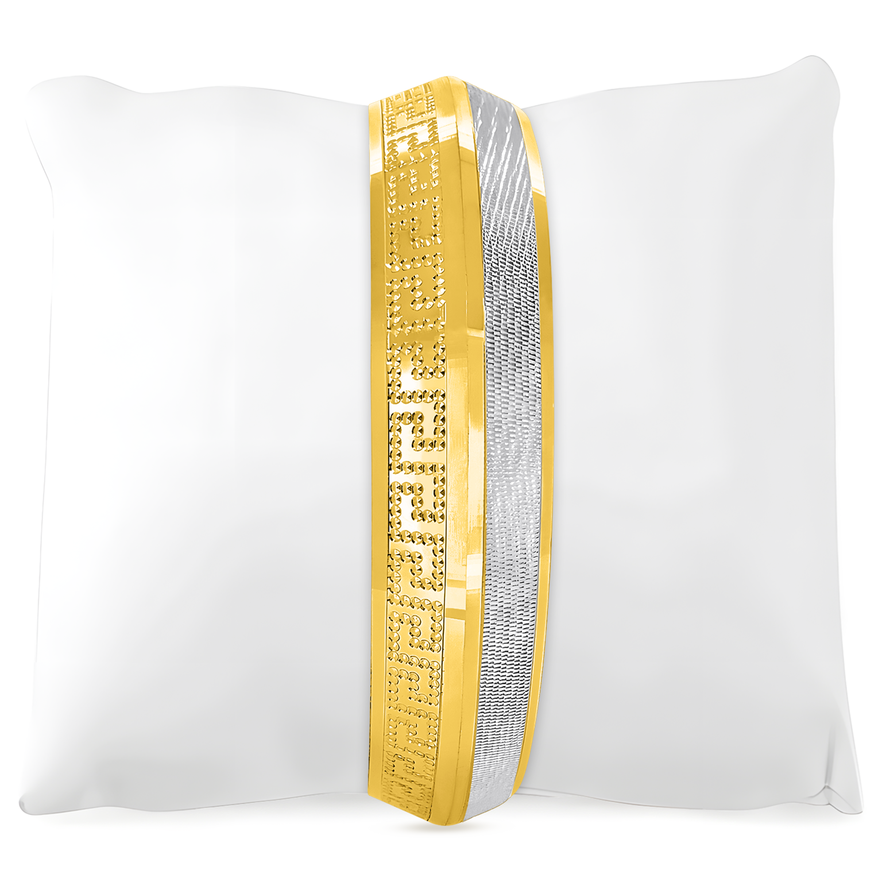 A stylish 22K gold kada featuring a textured design on one side and a unique intricate pattern on the other, creating a perfect blend of tradition and modern elegance.