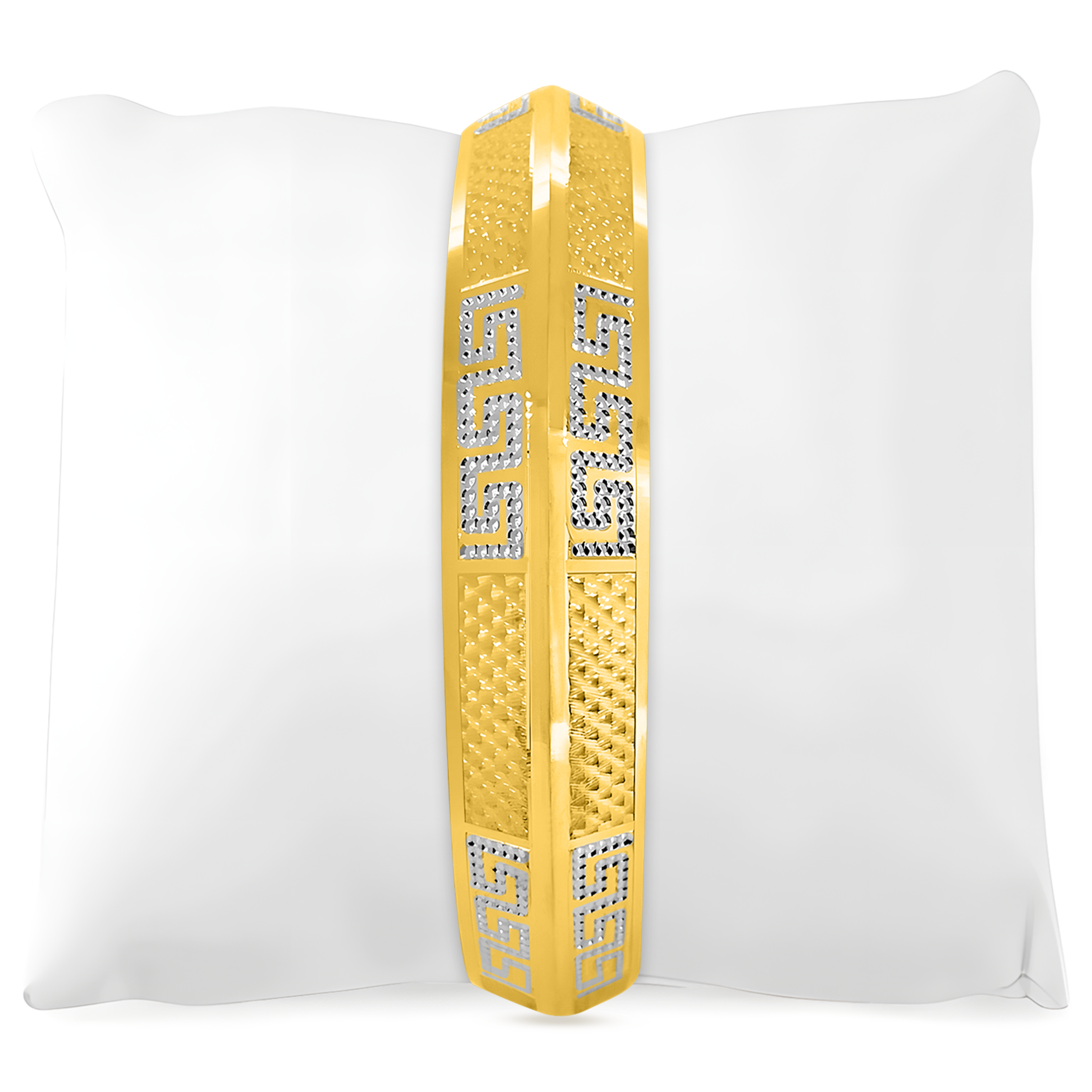 A sophisticated 22K gold kada featuring a unique pattern divided into six distinct sections, blending intricate craftsmanship.