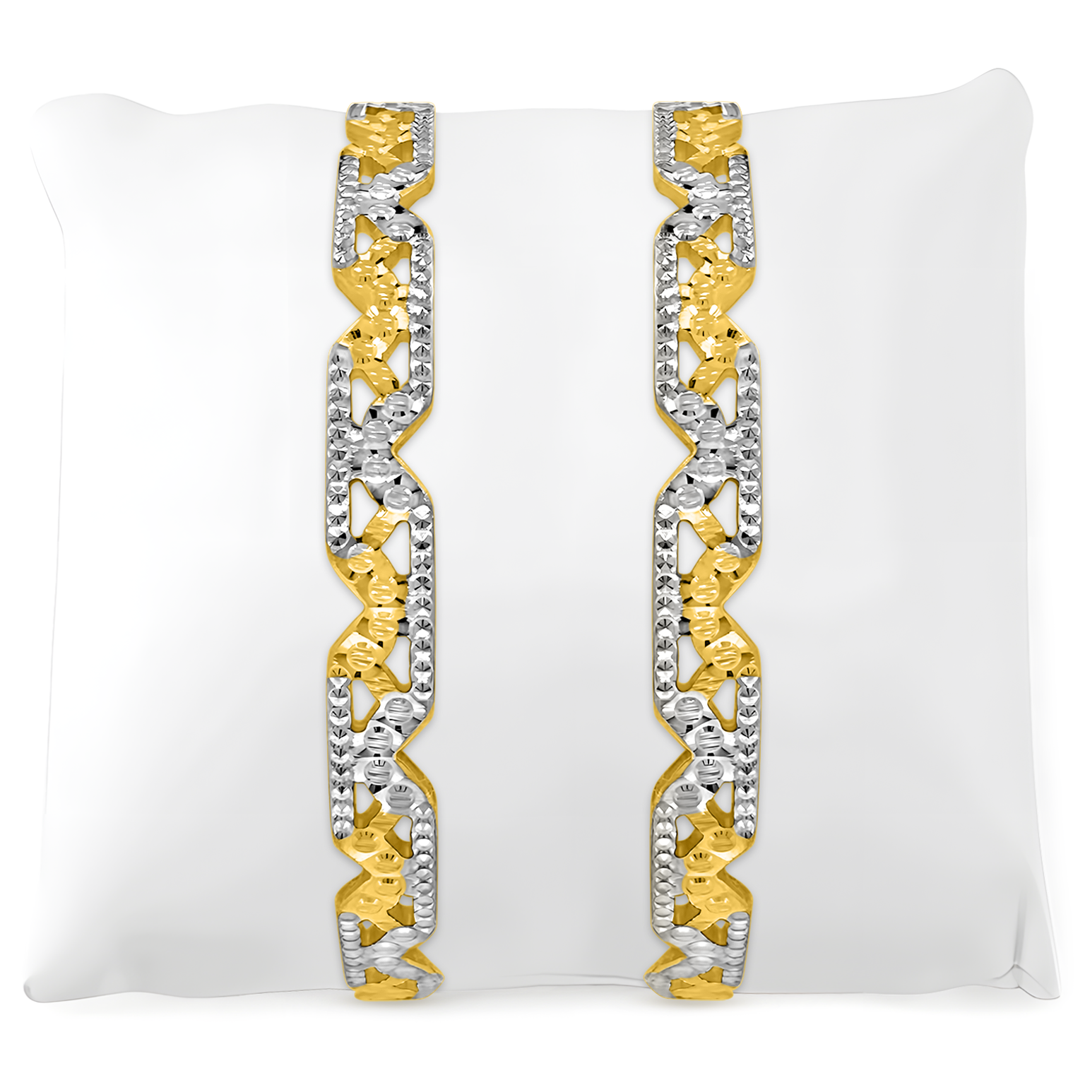 22K (916) gold bangles, set of two, available in classic all-gold or a refined two-tone rhodium hue on a gold base, catering to diverse tastes. These bangles feature an exquisite laser-cut sparkling design on a satin base, blending intricate artistry with a modern touch. Available in various sizes, this set offers a radiant elegance perfect for enhancing both everyday looks and special occasions.