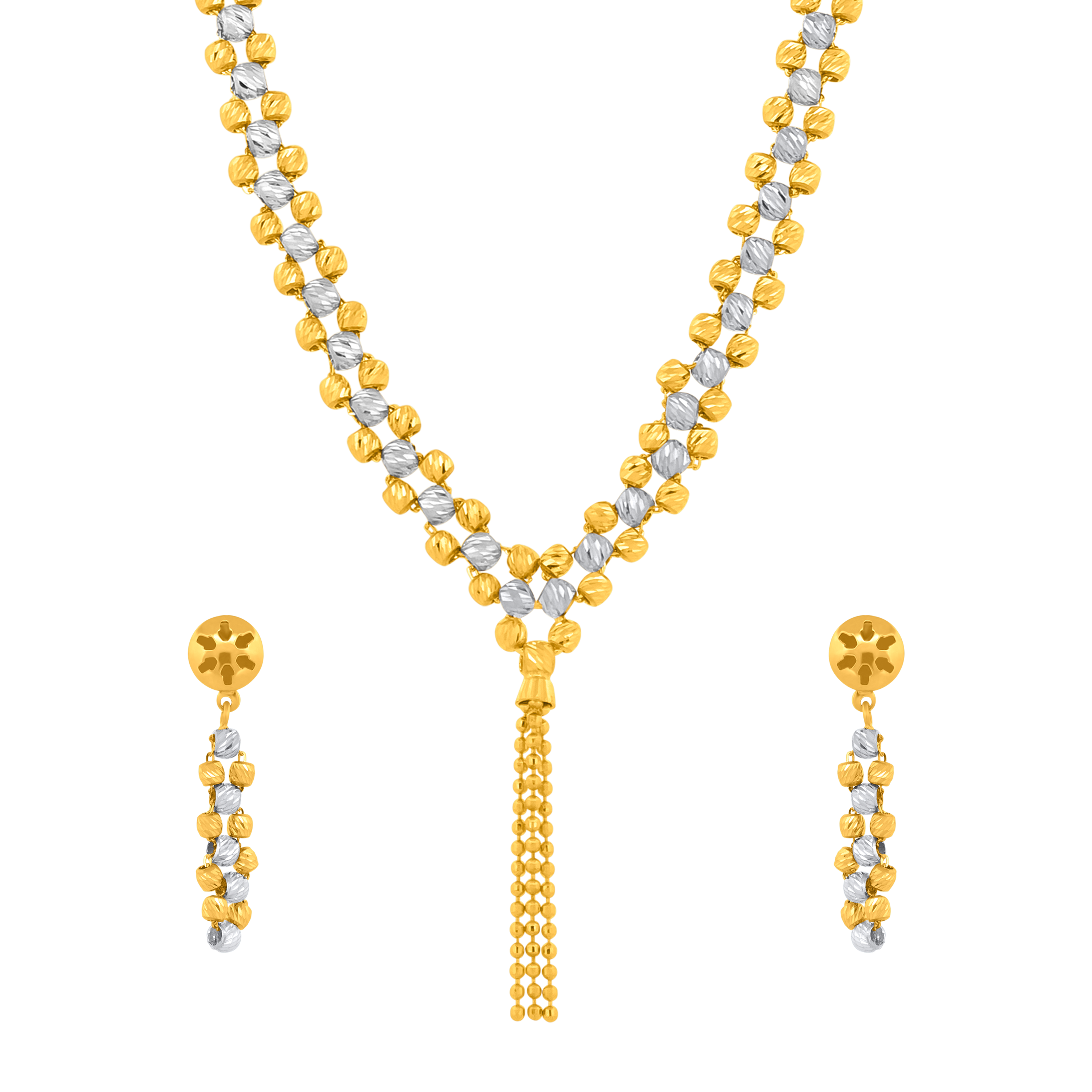 22K (916) gold necklace and earring set with alternating gold and rhodium beads, featuring a delicate tassel drop—elegant and perfect for festive occasions.