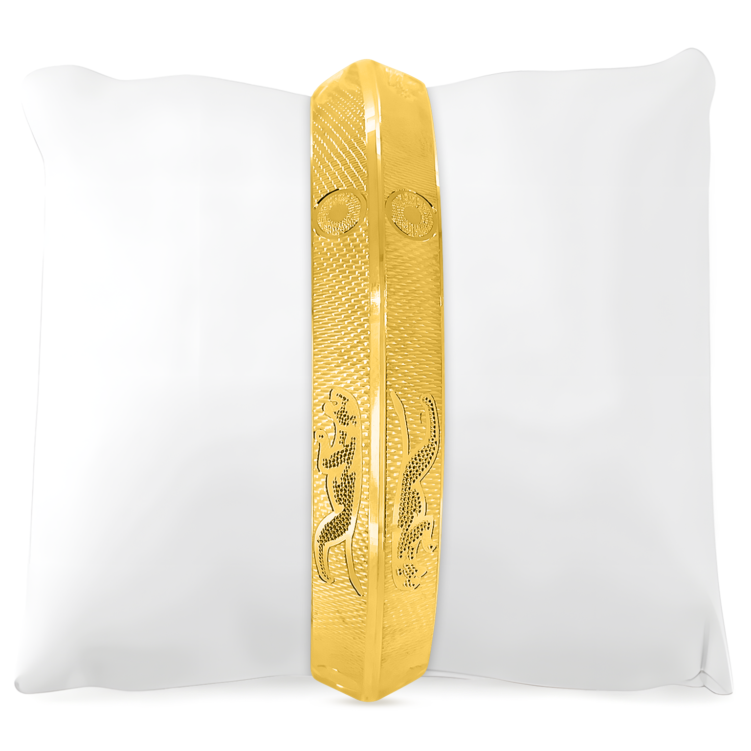 A sophisticated 22K gold kada featuring a unique pattern divided into distinct sections, blending intricate craftsmanship.