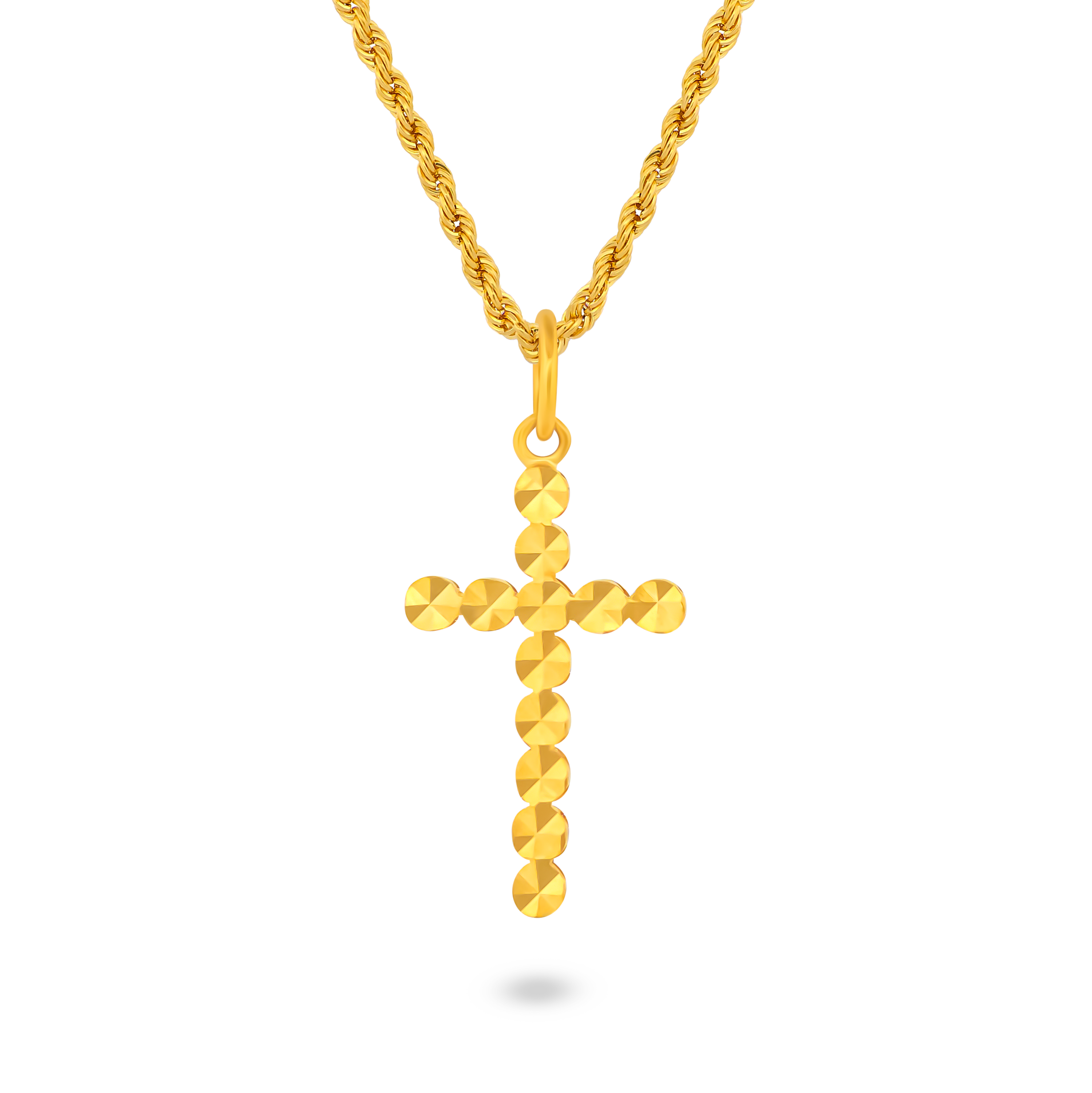 This stunning gold cross pendant necklace features a unique beaded design with faceted details that enhance its brilliance.