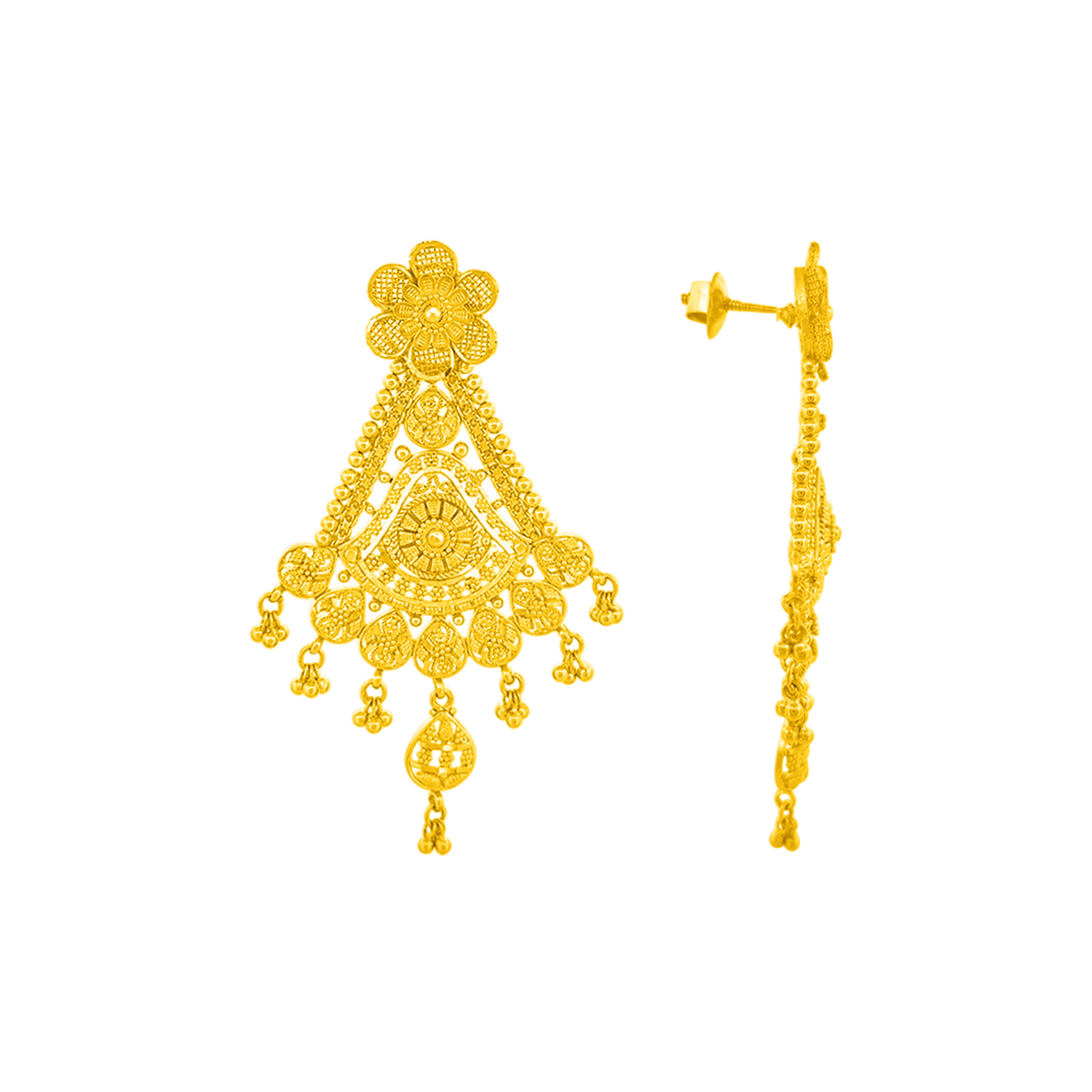 Elegant gold earrings with intricate motifs inspired by nature. Perfect for a traditional and graceful look.