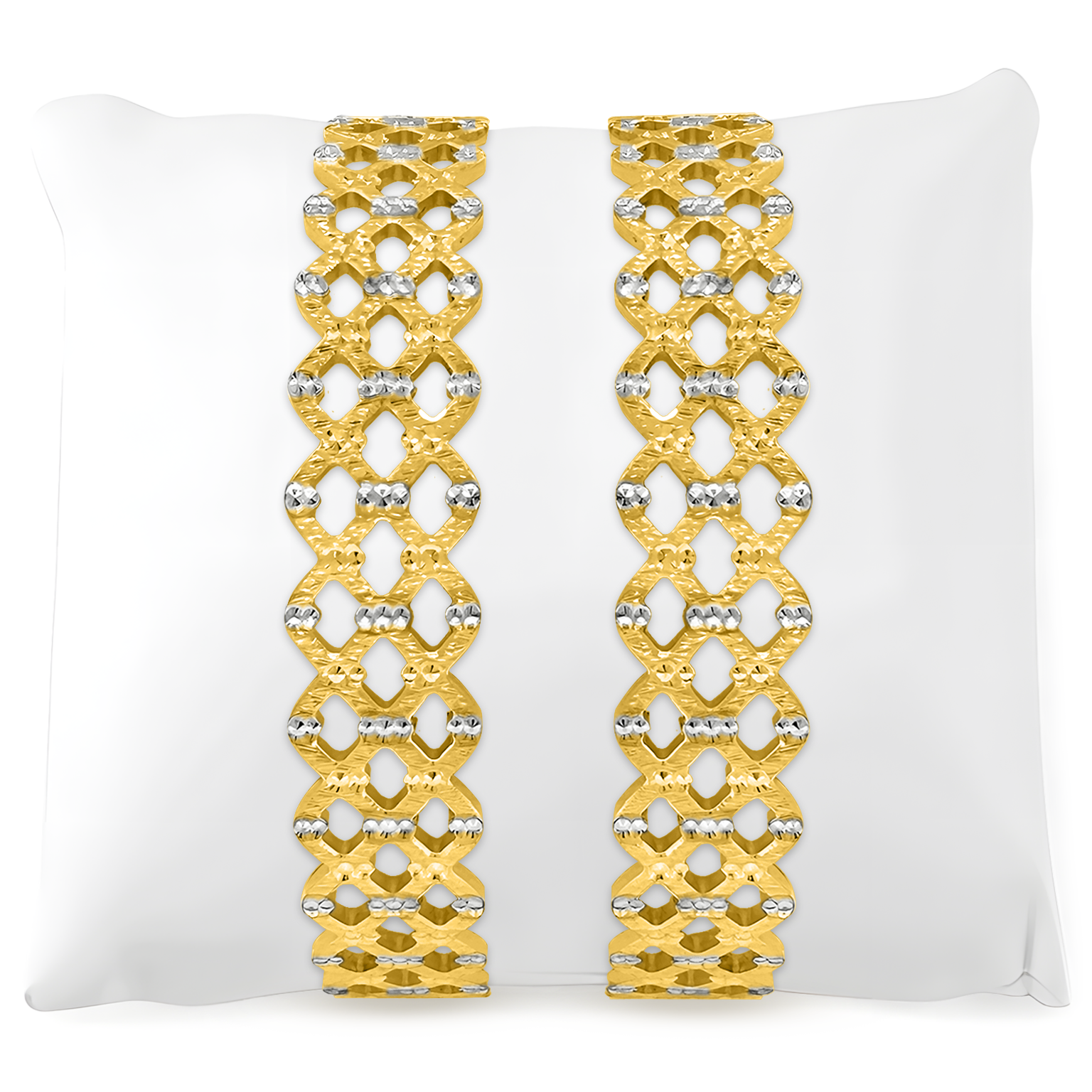 22K (916) gold bangles, set of two, available in classic all-gold or a refined two-tone rhodium hue on a gold base, catering to diverse tastes. The design features a delicate laser-cut lace-like pattern on a satin base, showcasing intricate craftsmanship and refined elegance. Perfect for any occasion, these bangles are available in various sizes, offering a timeless blend of beauty and sophistication.
