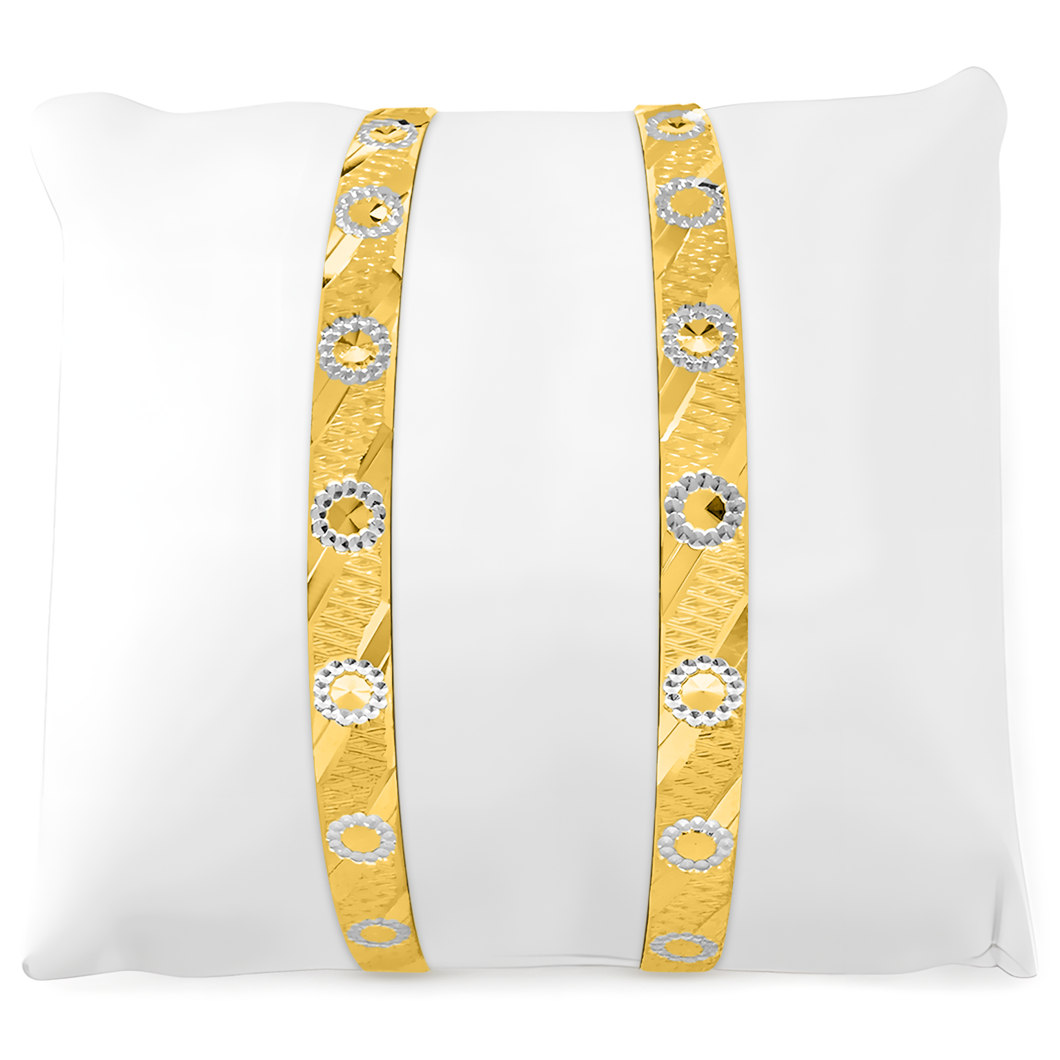 22K (916) gold bangle set of two bangles, available in classic all-gold or a refined two-tone rhodium hue on a gold base, catering to diverse tastes. Neither too thick nor too thin, these versatile bangles can be layered for a more striking look. The design features a round floral pattern accented by a high-polish strip and frosted finish, offering a perfect balance of elegance and versatility. Available in various sizes, these bangles are a timeless addition to any jewelry collection.