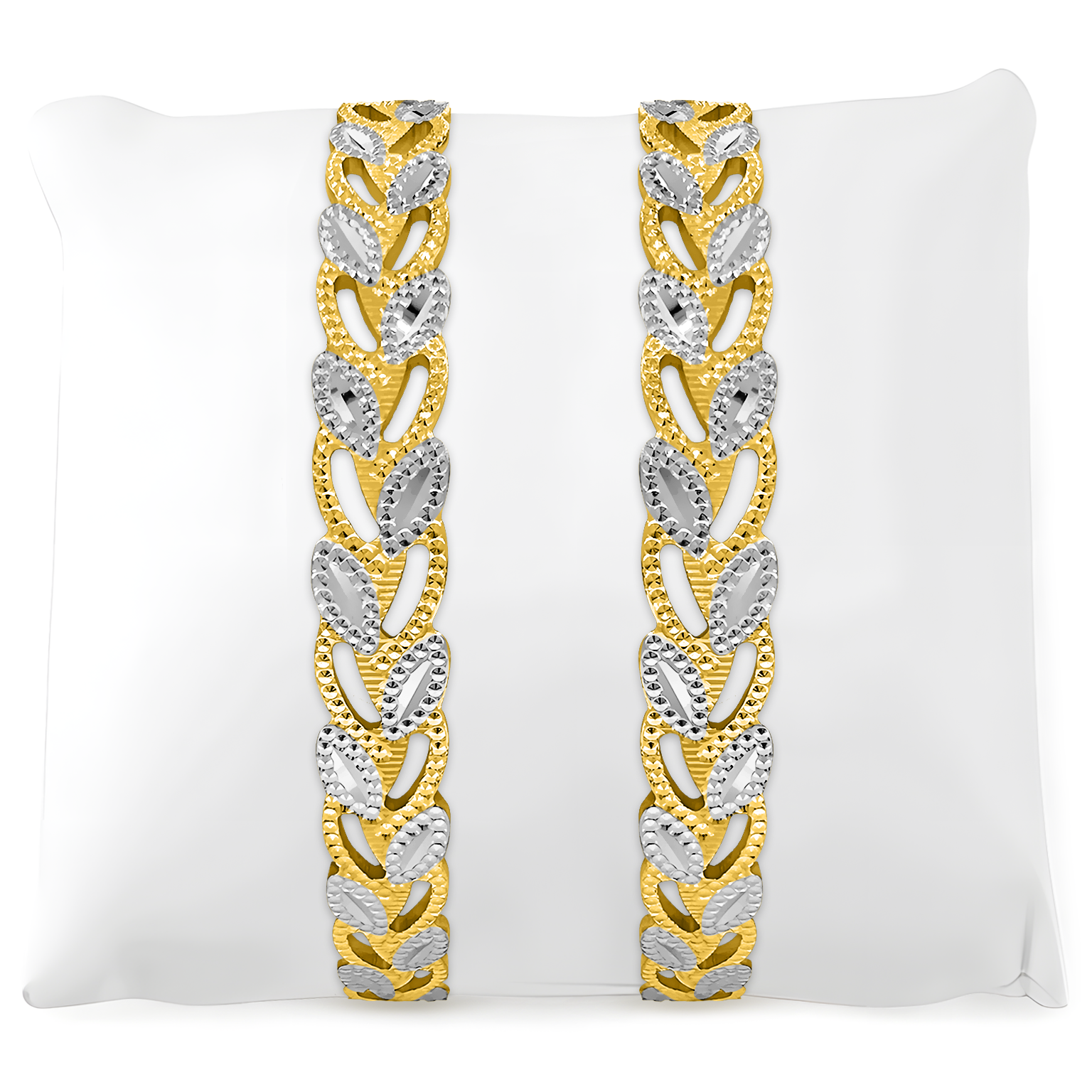 22K (916) gold bangles, set of two, available in classic all-gold or a refined two-tone rhodium hue on a gold base, catering to diverse tastes. The design features an intricate laser-cut leaf pattern on a satin finish, blending modern craftsmanship with timeless beauty. These versatile bangles, available in various sizes, can be layered for a bold look or worn alone for understated elegance, making them a perfect addition to any jewelry collection.