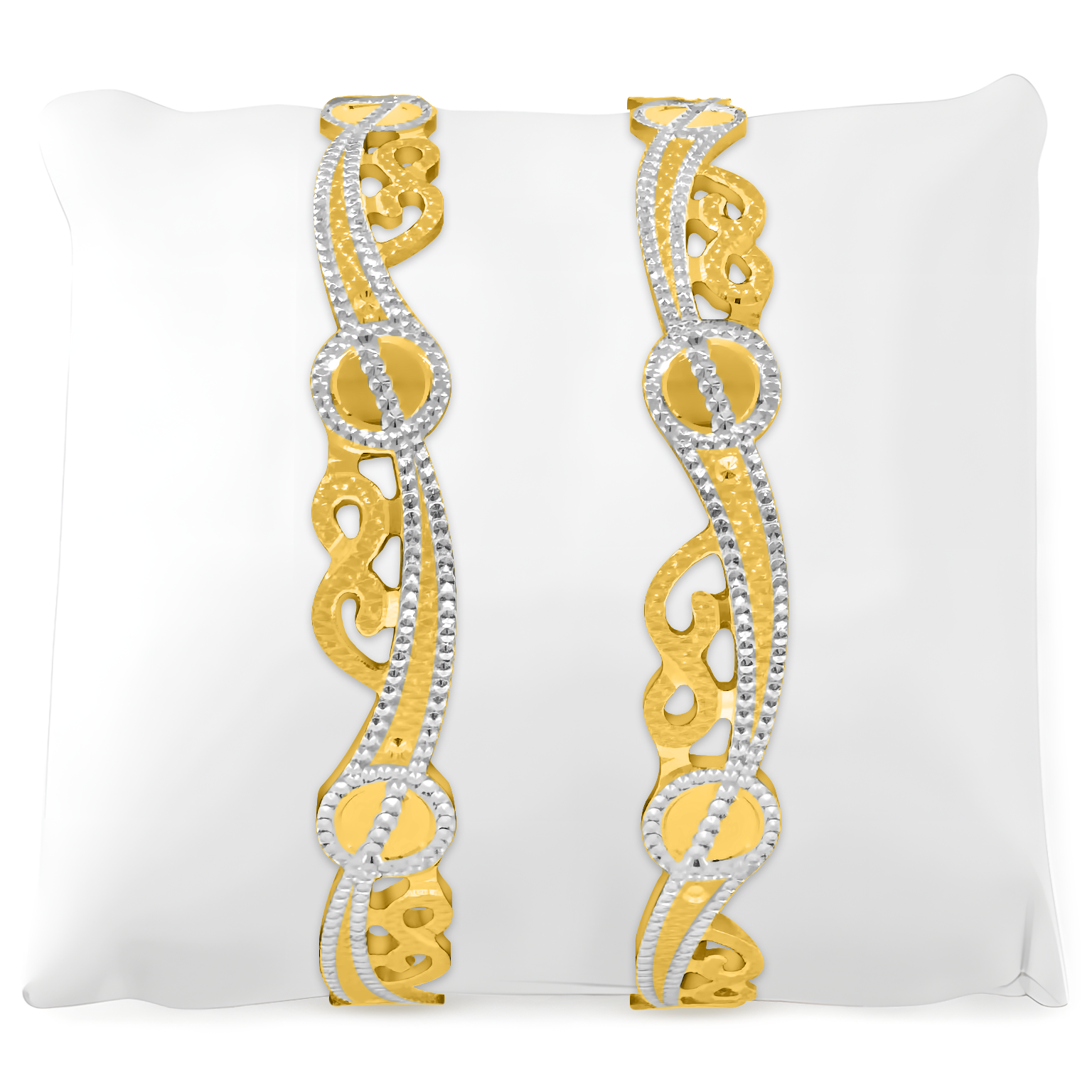 22K (916) gold bangles, set of two, available in classic all-gold or a refined two-tone rhodium hue on a gold base, catering to diverse tastes. The design features a sparkling laser-cut pattern on a satin base, enhanced with a frosted texture, creating a refined and sophisticated look. Available in various sizes, these bangles offer a modern twist on classic elegance, perfect for both everyday wear and special occasions.