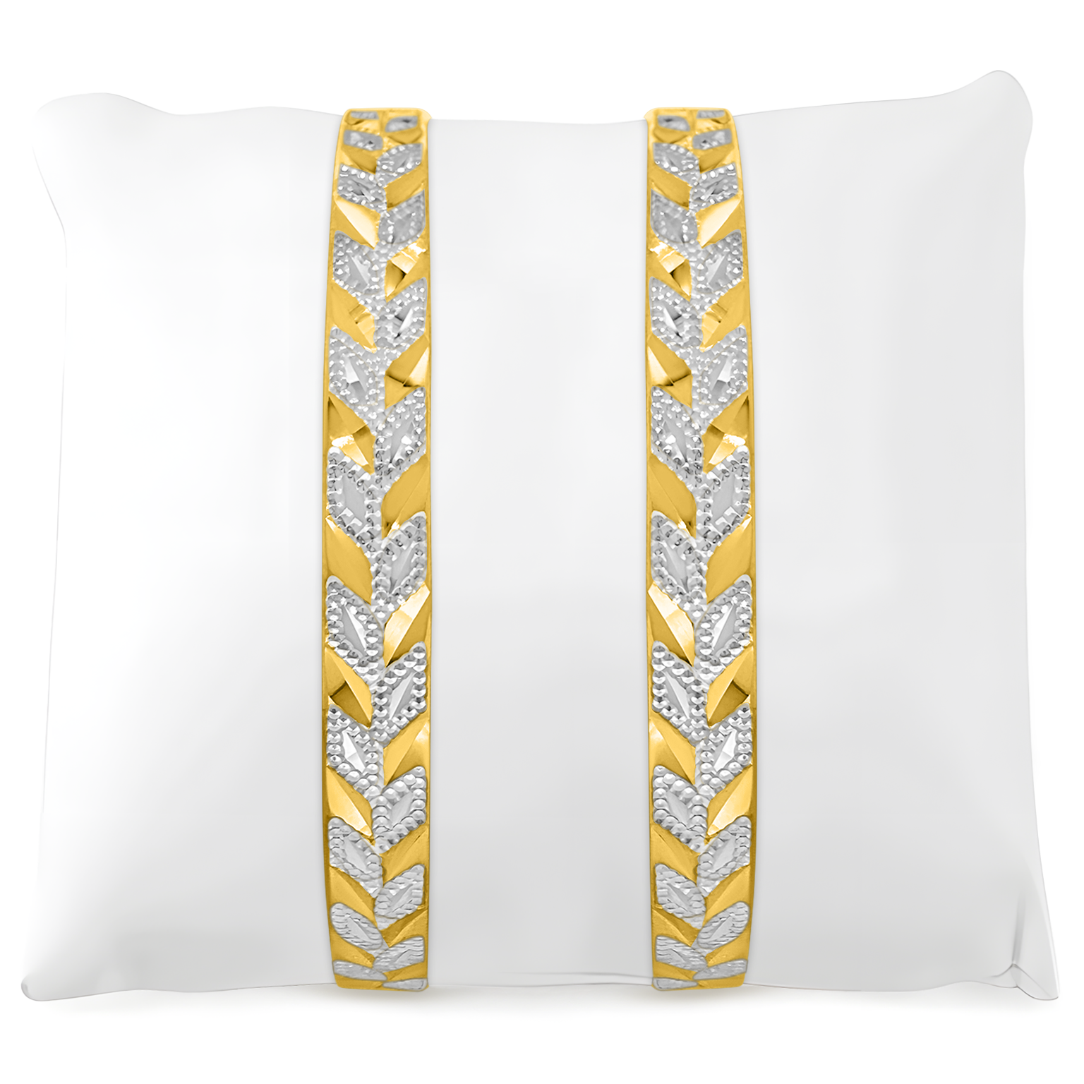 22K (916) gold bangle set of two bangles, available in classic all-gold or a refined two-tone rhodium hue on a gold base, catering to diverse tastes. The design features a high-polish finish with a sparkling design, offering a touch of elegance and brilliance. Neither too thick nor too thin, these bangles are versatile enough to be layered for a bold statement. Available in various sizes, they are perfect for adding a radiant shine to both casual and formal looks.