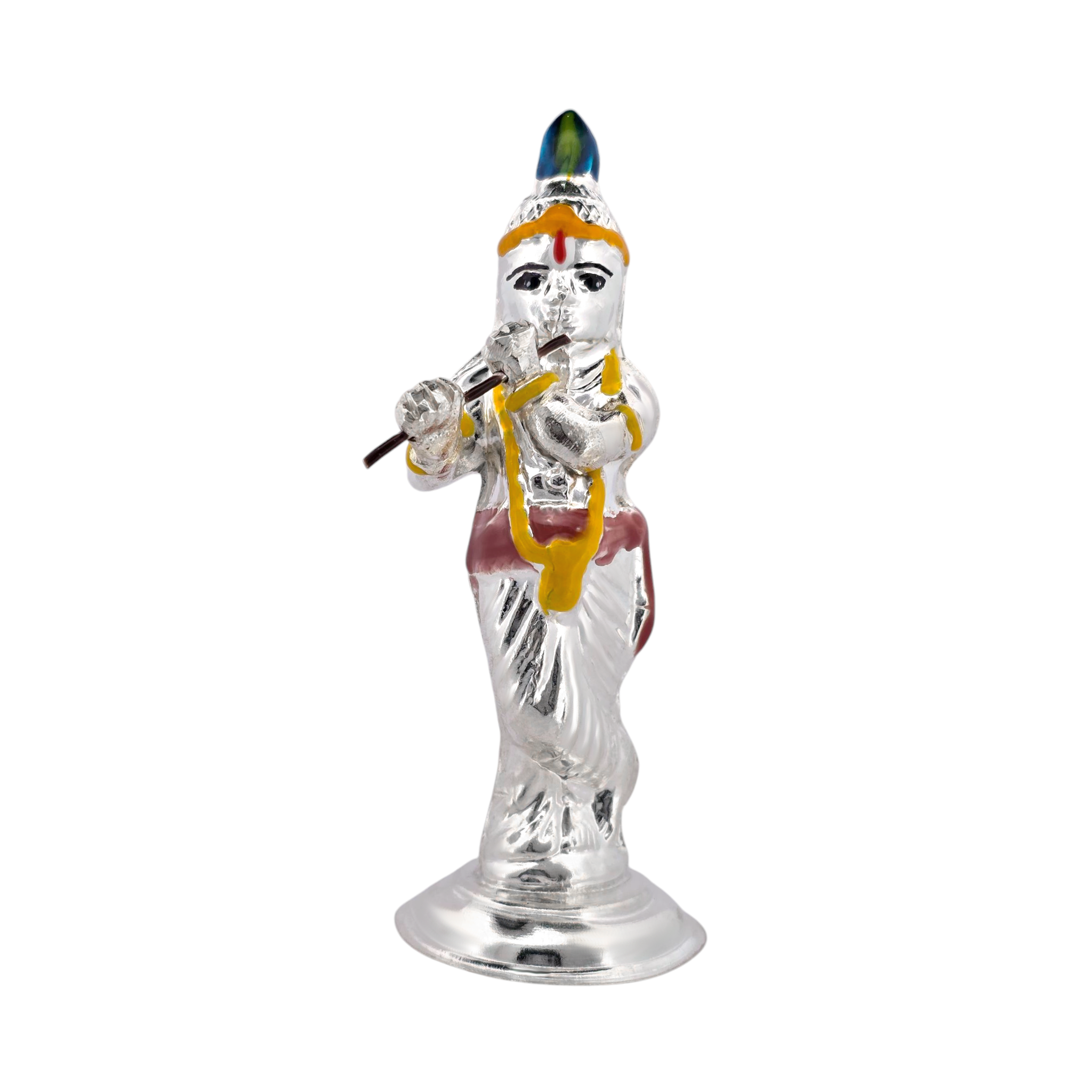 This graceful 925 silver idol showcases Lord Krishna playing his divine flute, symbolizing love, wisdom, and harmony.