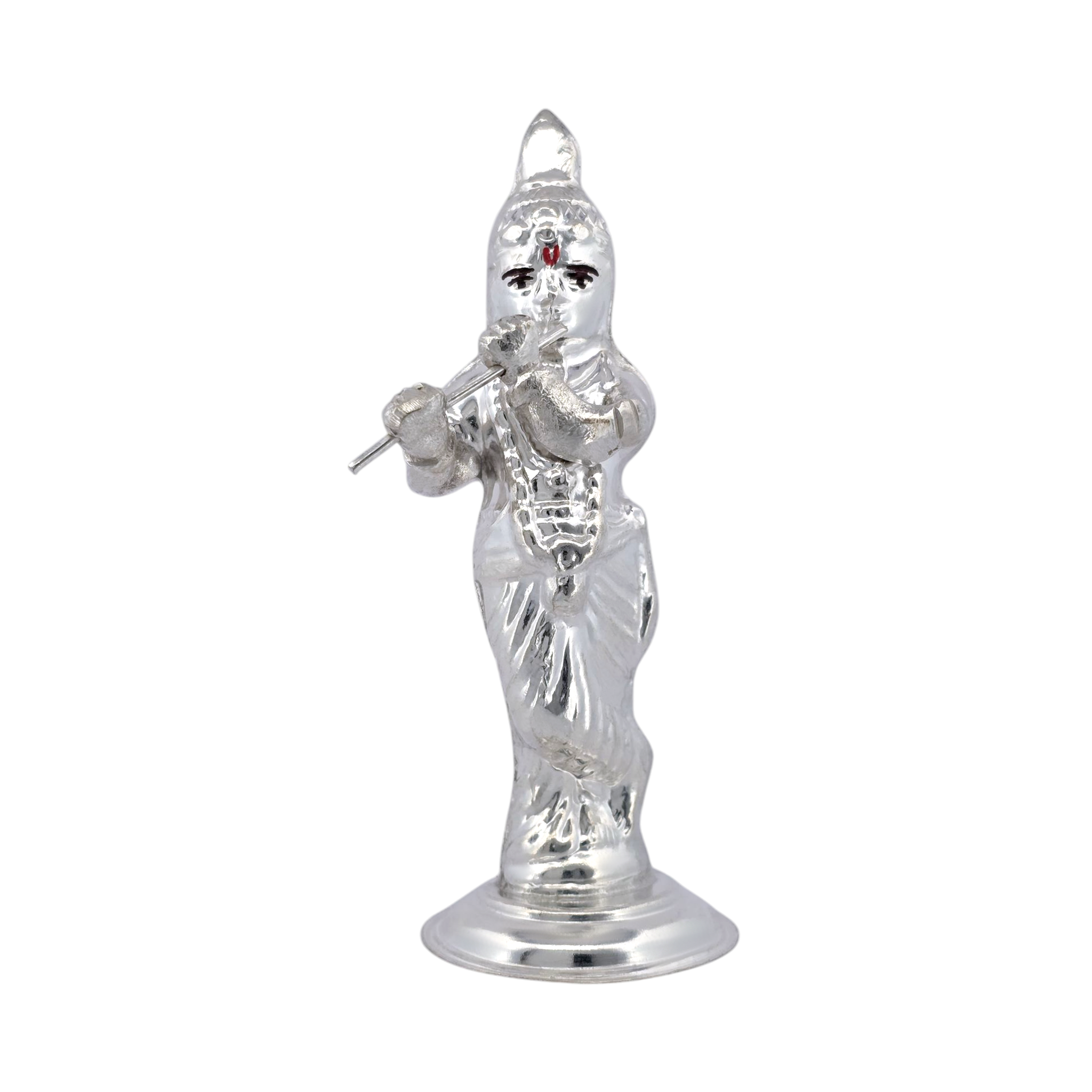 This elegant 925 silver idol of Lord Krishna, playing His divine flute, beautifully embodies serenity and spiritual bliss.