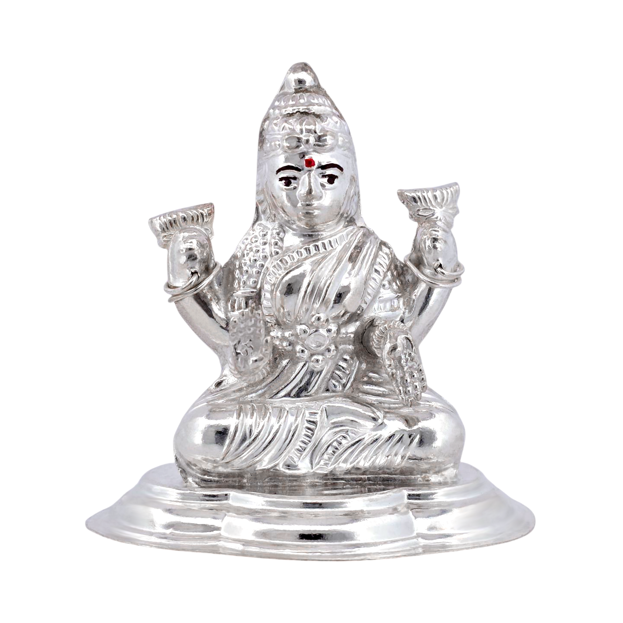 This exquisite silver idol portrays Goddess Lakshmi, the divine goddess of wealth and fortune, seated gracefully in a lotus pose.