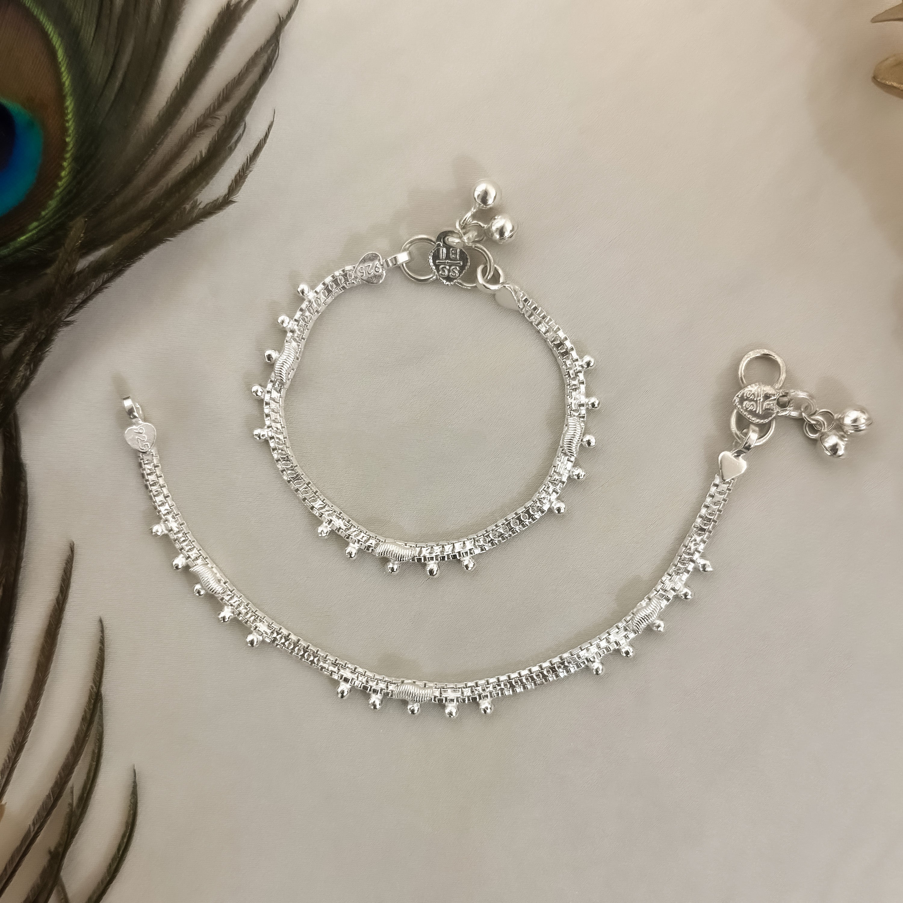 Silver anklets that feature textured band and accented by tiny, delicate silver bead.