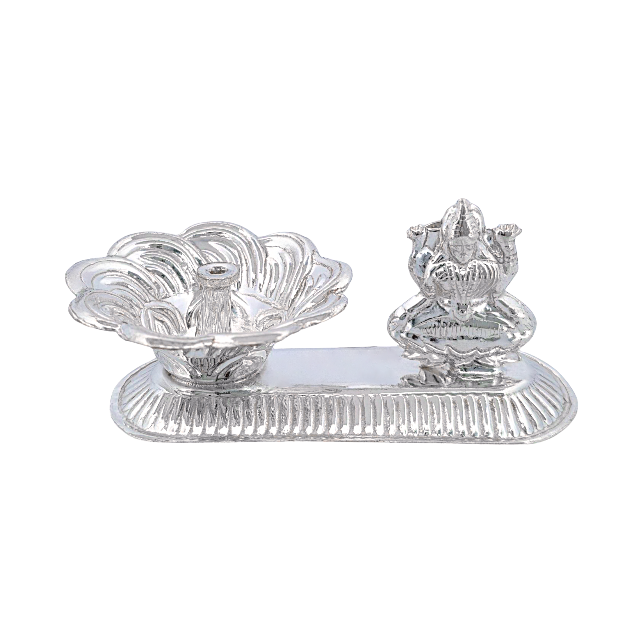 A beautifully crafted 925 silver diya stand featuring a floral-shaped oil lamp and a finely detailed idol of Goddess Lakshmi.