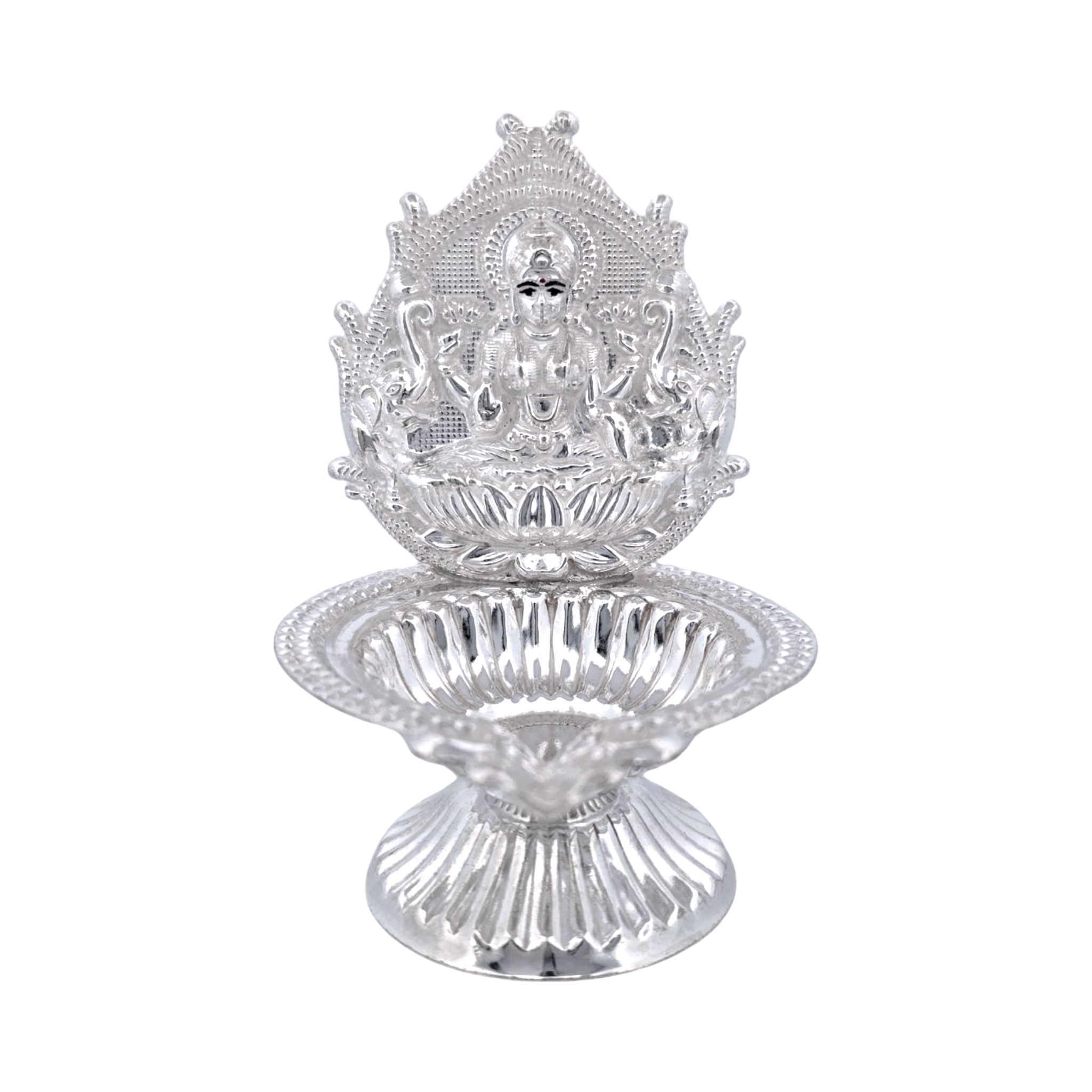 Elegant 925 silver Kamakshi Deepak featuring Goddess Lakshmi on a lotus, flanked by elephants symbolizing wisdom and abundance.