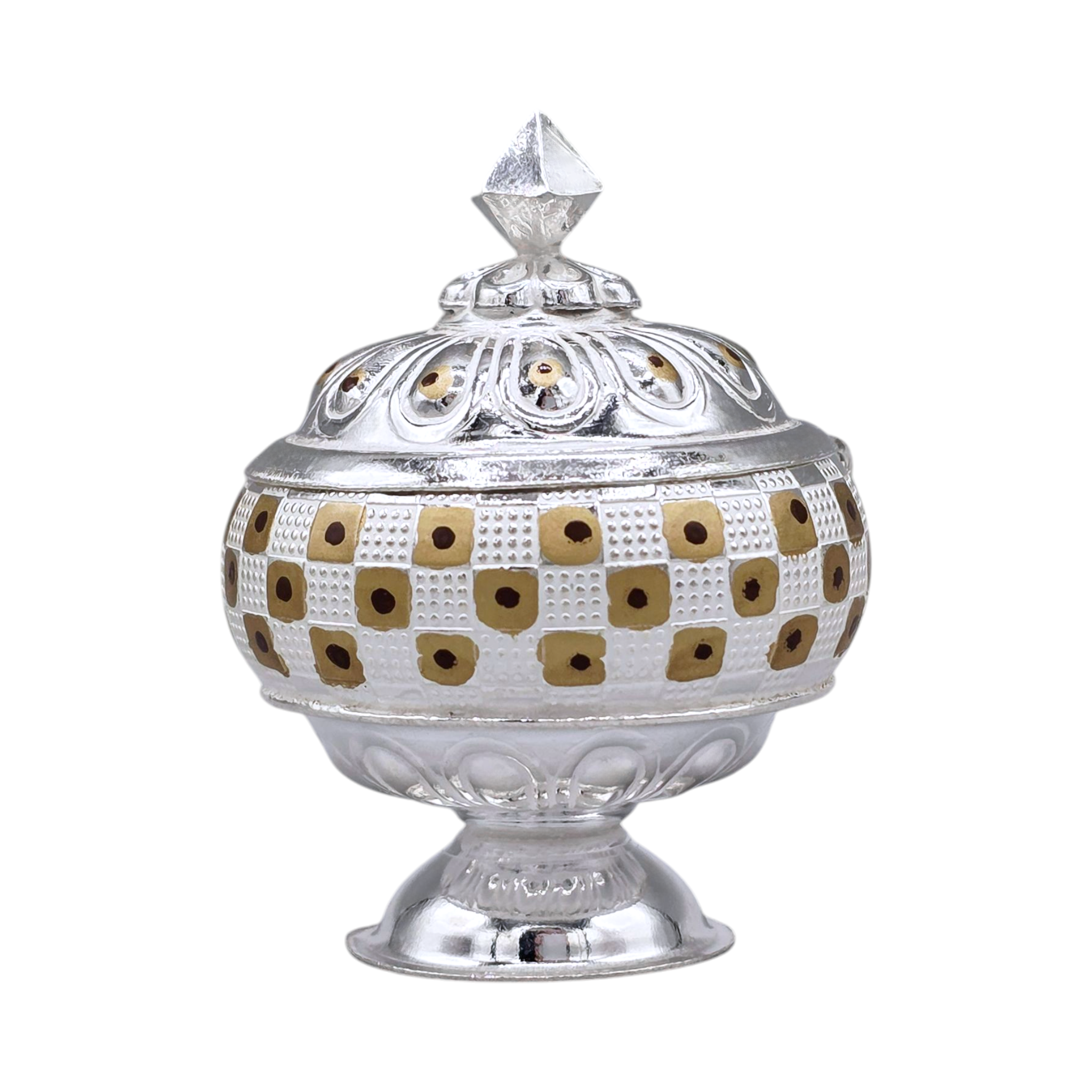 This elegant 925 silver kumkum box features a dome-shaped lid adorned with intricate carvings with golden/brown accent and a diamond-shaped finial.